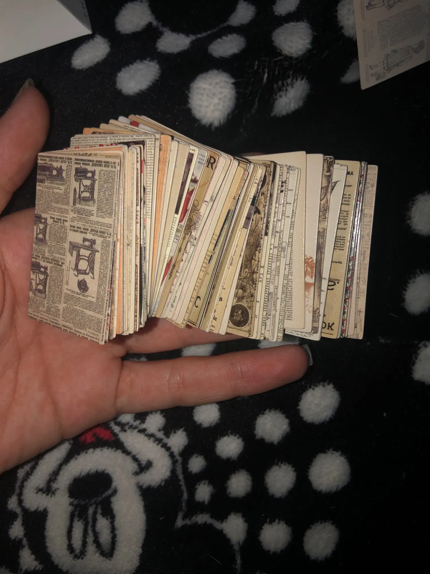 Карточки очень приятные, двусторонние. В одном «коробке» их 200 штук, так что хватит на много страниц скрапбука. Печать хорошая, четкая. Обязательно закажу ещё с другой тематикой. Доставили в Москву меньше чем за две недели, объединив с другой посылкой.