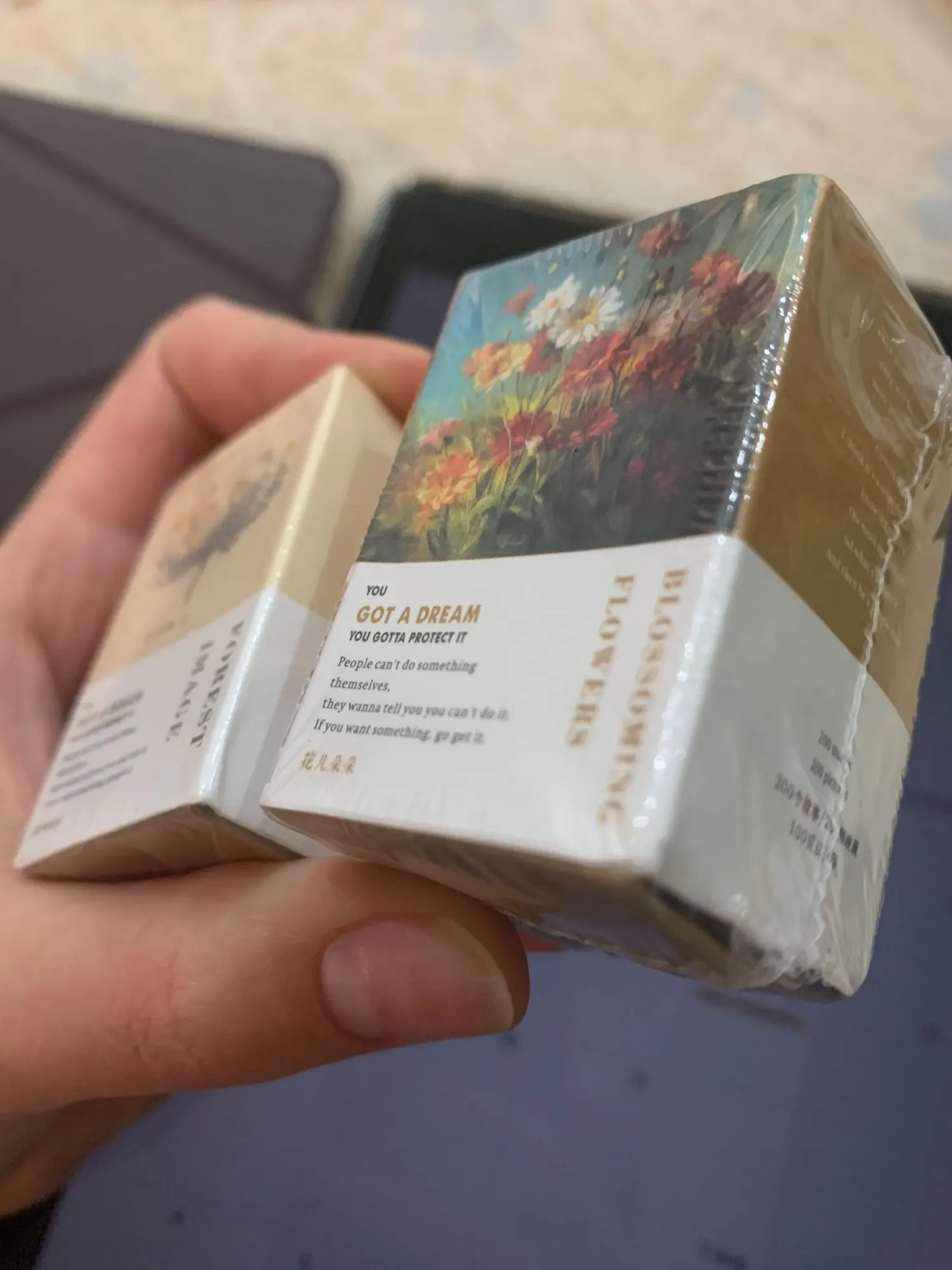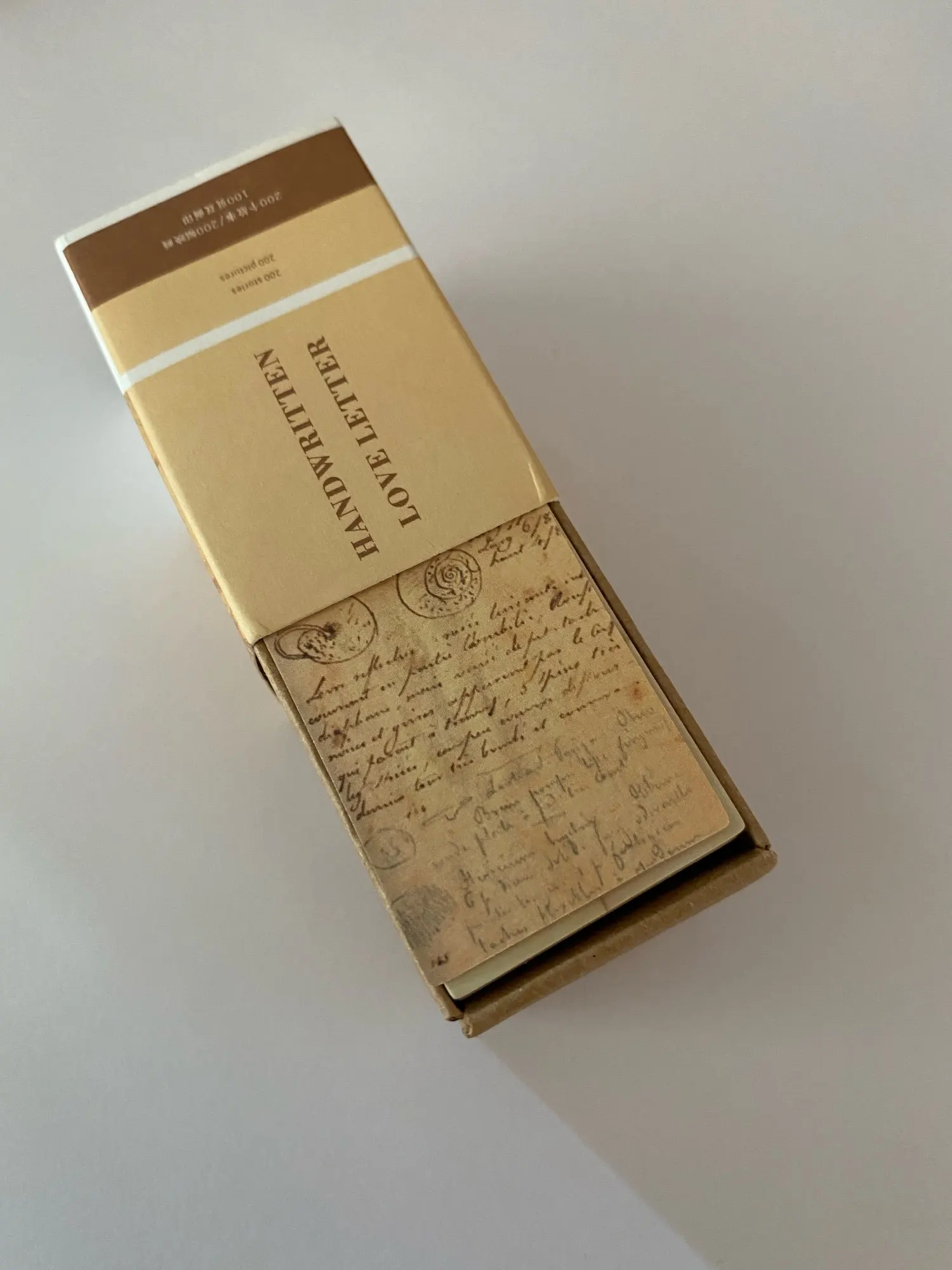 ¡Vienen por las dos caras! No sabía que eran dos diseños en uno, y la verdad es que no sé cómo me siento al respecto. Prefiero 200 separadas a 100 por las dos caras... Pero son preciosas igualmente. De cartón, no son pegatinas. Y algunas vienen mal impresas, porque las letras se leen al revés (efecto espejo).