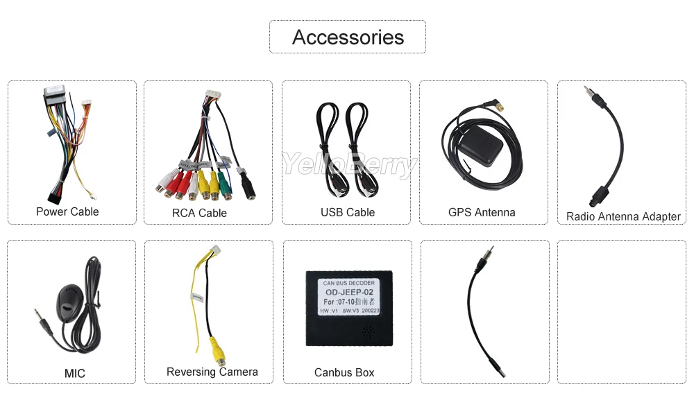 Один кабель RCA с внешним входом микрофона, один кабель камеры заднего вида с Wi-Fi и сигнальными кабелями BT, один антенный кабель GPS, два usb-кабеля, один установочный инструмент и один внешний микрофон в качестве подарка