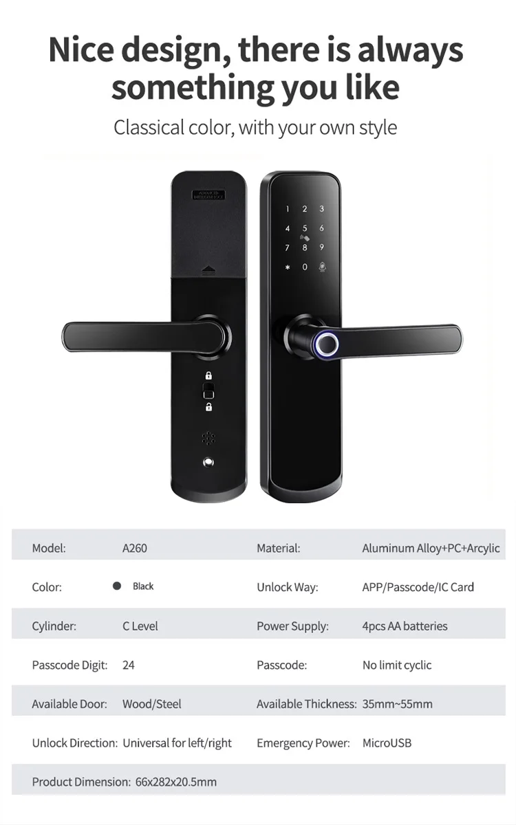 Приложение TT Lock/отпечаток пальца/Пароль/смарт-карта/разблокировка ключа Поддержка обычного открытого режима (свободный доступ) Размер врезного замка Английский Голос Панель для волочения проводов Матовый корпус Универсальный как для правой, так и для левой двери