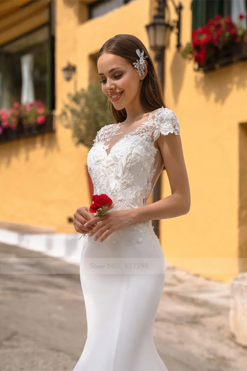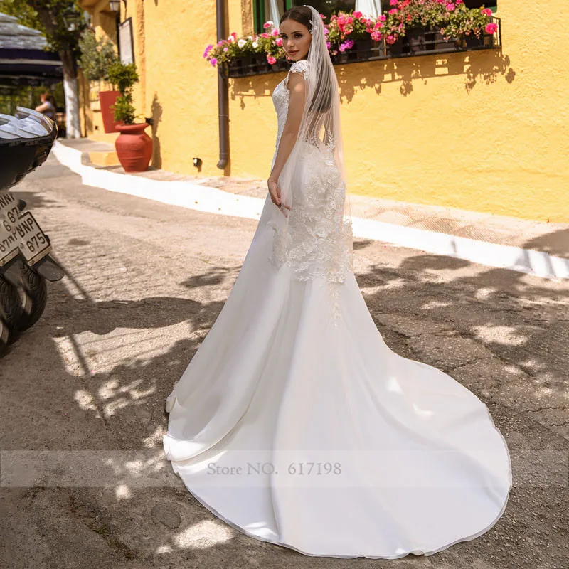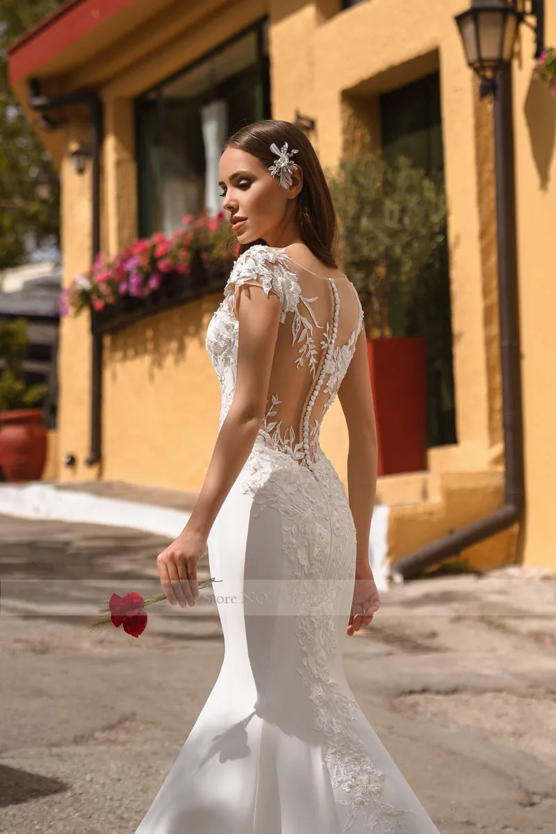 Кружевное свадебное платье с глубоким круглым вырезом и рукавом-крылышком