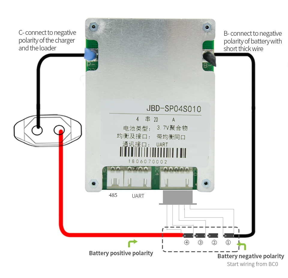 B-Подключите первую нитку отрицательного полюса аккумуляторного блока, то есть общий отрицательный полюс аккумуляторного блокаC-подключение к зарядке и разрядке отрицательных полюсовBC3 Подключите 3-ю нитку положительного полюса аккумуляторного блока, это общий положительный полюс аккумуляторного блокаBC2 Подключите второй шнур положительного полюса аккумуляторного блокаBC1 Подключите первую нитку положительного полюса аккумуляторного блокаКоммуникационная плата интерфейса UART серийный порт соединяет bluetooth или коммуникационная плата интерфейса UART блок связи, 485Последовательный порт связи подключает модуль связи 485 или связь 485Устройство, после установки, пожалуйста, установите номинальную емкость аккумулятора и емкость циркуляцииЧерез приложение или программное обеспечение PC Номинальная мощность = фактический объем памяти, емкость циркуляции = фактическая емкость * 0,8