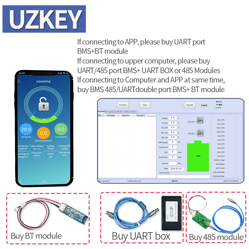 1. Если вам нужно подключить ваш мобильный телефон, вам нужно купить BMS с коммуникационная плата интерфейса UART порт или коммуникационная плата интерфейса UART порт, а затем добавить модуль bluetooth.2. Если вы Подключите компьютер только для чтения данных, вам нужно купить BMS, а затем добавить UART box,3. Примечание: модуль Bluetooth/UART box и ЖК-дисплей не могут быть использованы одновременно, из-за того, что они могут быть подключены только с одним общим портом4. Если вам нужно подключить ПК и мобильный телефон, пожалуйста, купите UART/RS485 double-communication BMS, затем купите модуль Bluetooth и Модуль RS485