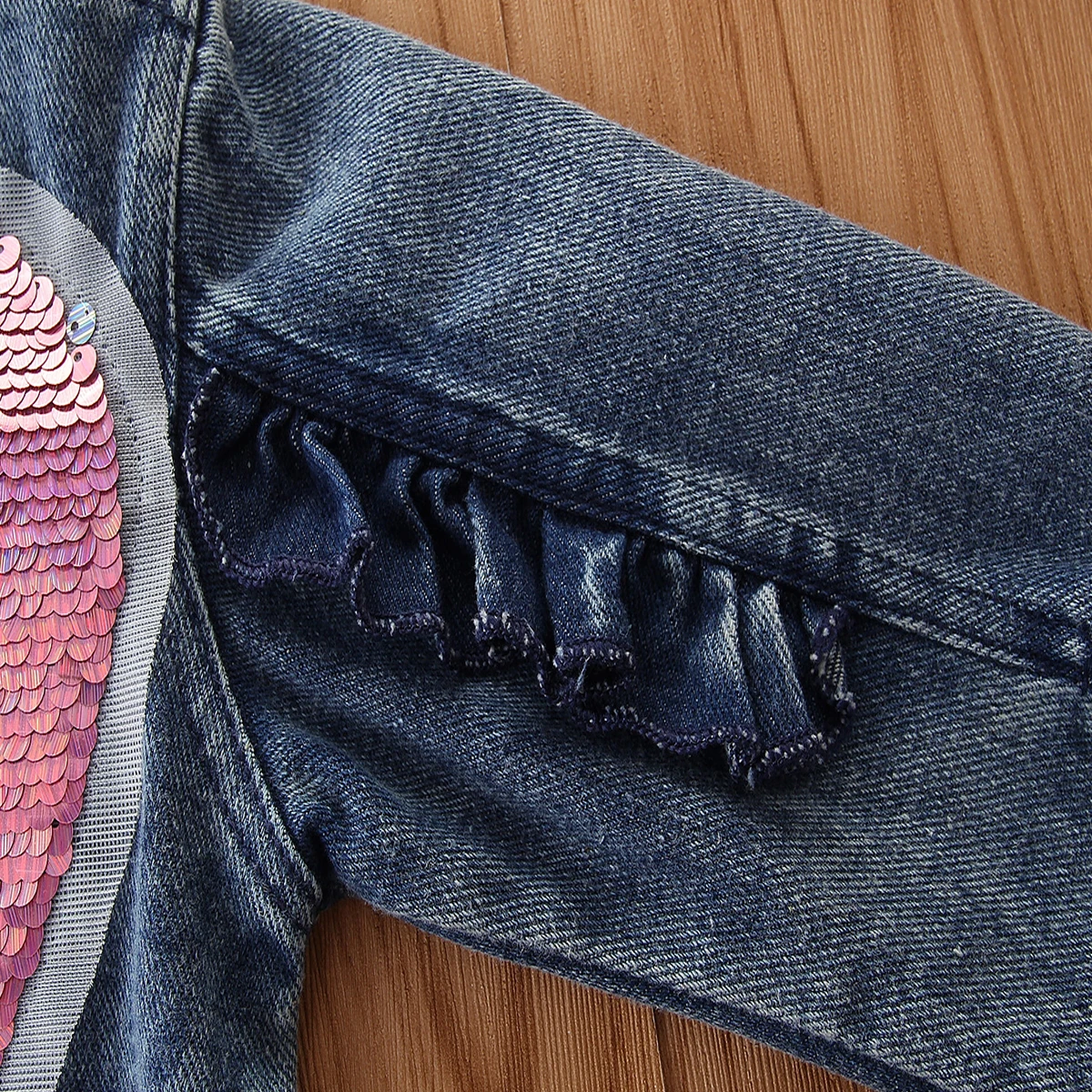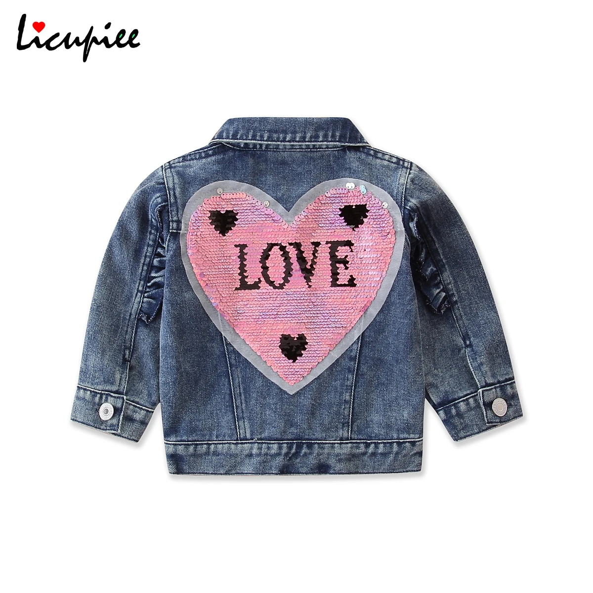 Детская джинсовая куртка, с отложным воротником, длинными рукавами, украшенная бисером, в форме сердца и блестками, для маленьких девочек, осень