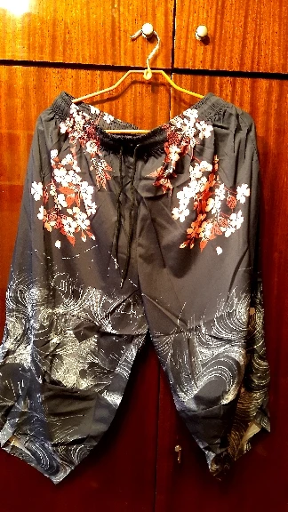 хорошие симпатичные штанишки из синтетической ткани. можно носить дома или летом. купили в комплекте с кимано. получился классный костюмчик.