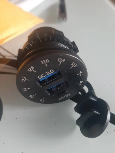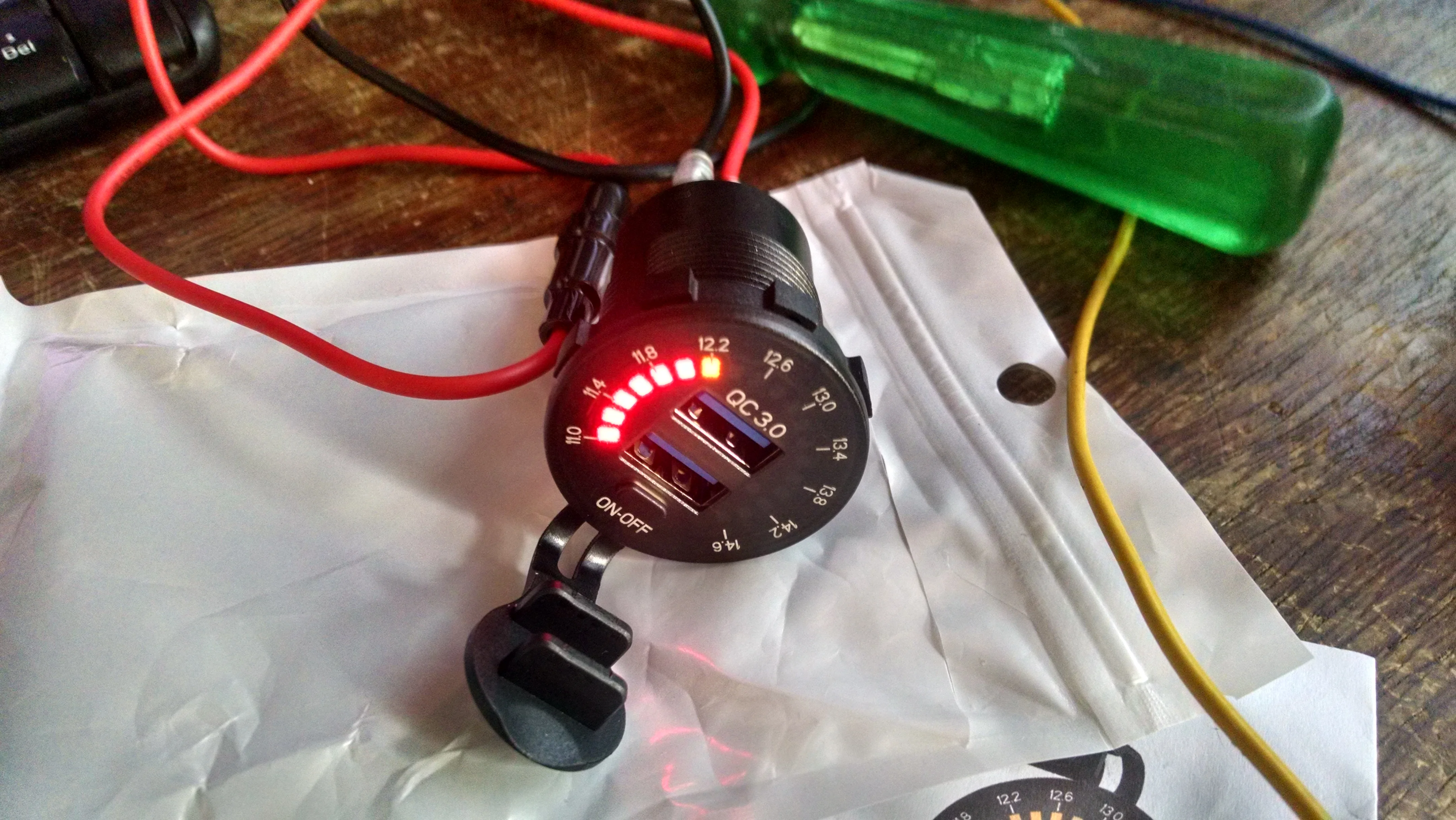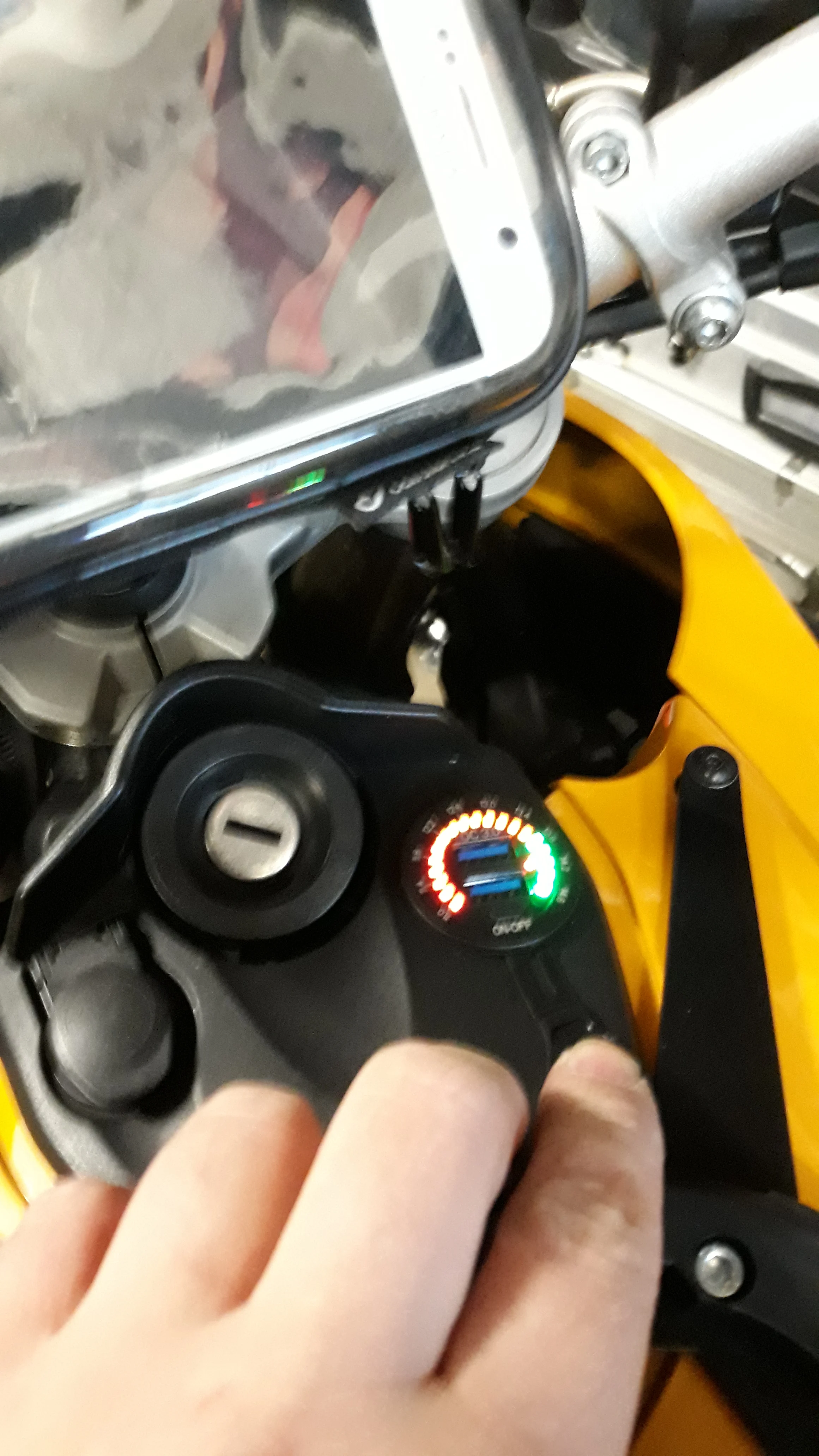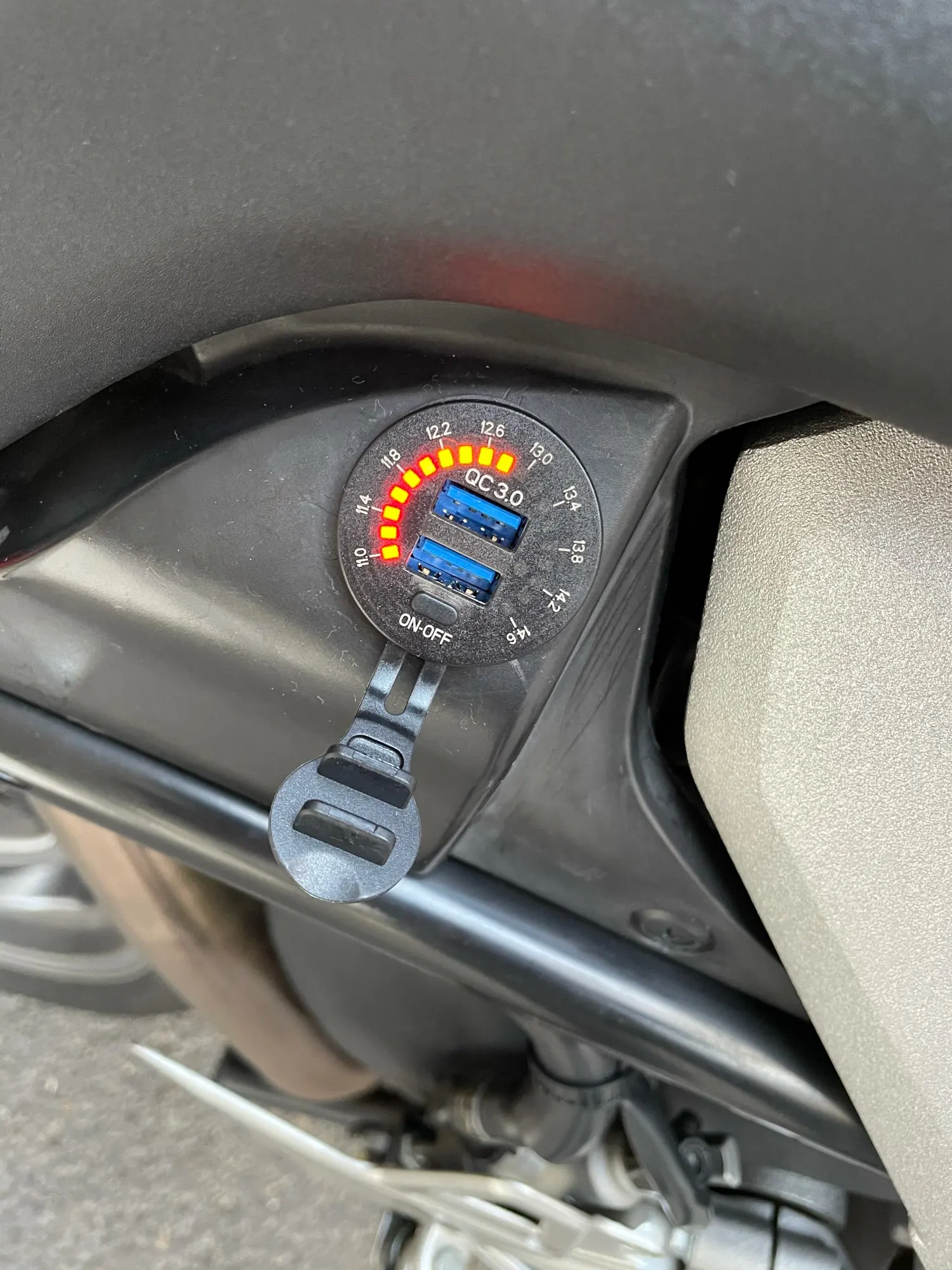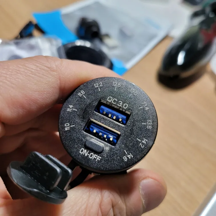 great usb socket. stays off when turning on motorcycle, one press of button shows current voltage, second press turns on usb sockets. usb 3.0 fast charge and usb c ports. 10/10