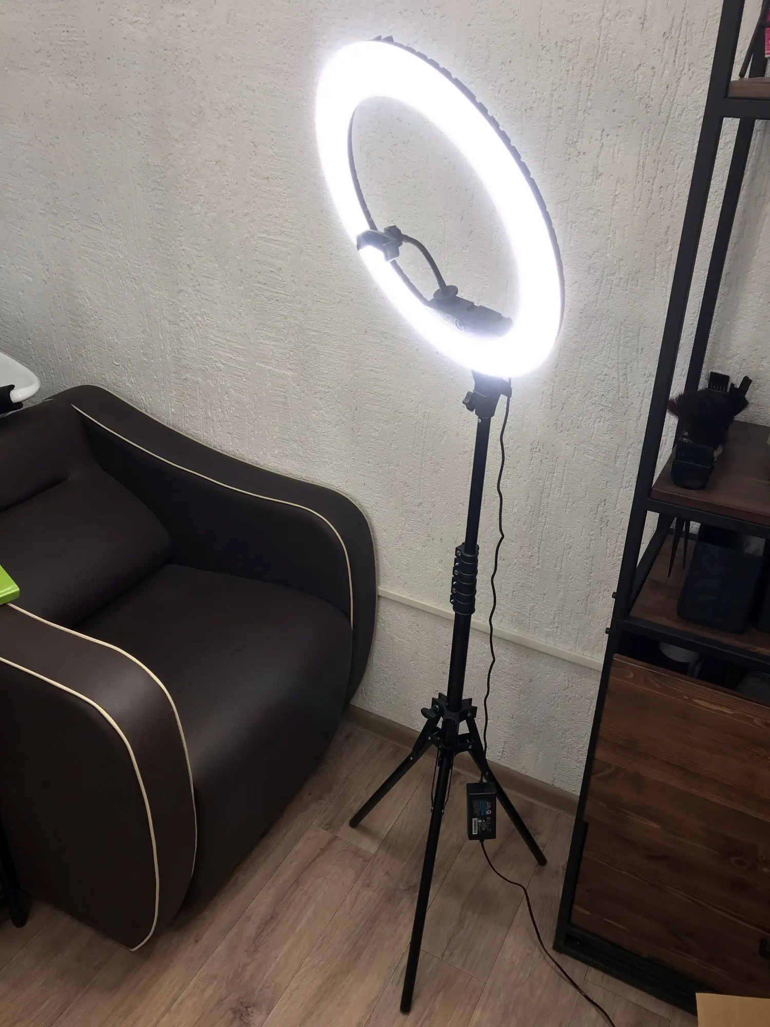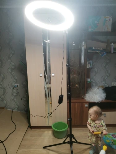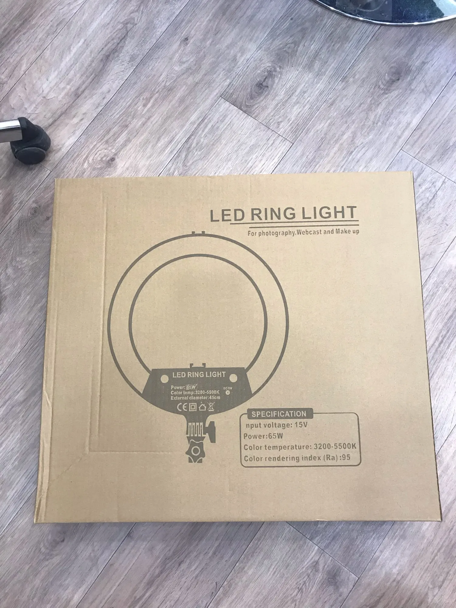 Лампа пришла за 5 дней в феврале. Стоимость вышла 4645.08 рублей. Диаметр 45 см мощность 65 W. Выбирала по отзывам из за качественного штатива, в других лампах таких же характеристик жаловались на крепления, в этой на самом деле все отлично, но посмотрю ее в работе. Я довольна