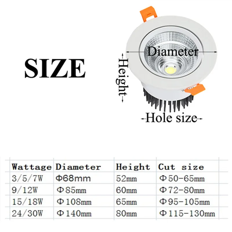 Длительный срок службы, низкая стоимость обслуживания Мгновенный запуск, не мигает Изготовлен из твердотельных элемент, противоударный Экономьте мощность более 90% от обычных ламп Долгое время работы, производят низкое тепло Нет радиочастотных помех Без ртути или других опасных материалов, соответствует RoHs Рабочая среда-20 градусов Цельсия ~ + 55 градусов Цельсия, подходит для необычного климата Технические характеристики: 100% Фирменная Новинка Вход: AC85-265V Материал корпуса: высококачественный алюминий, устойчивый и прочный. Быстро рассеивания тепла. Продолжительной работы. Потребляемая мощность: 6 Вт 9 Вт 12 Вт 15 Вт Светодиодный светильник источник/количество (шт): Высокий люмен COB, светодиодный чип epistar Люмены (лм): 100-110 лм/Вт Работая Temp. : -25 градусов Цельсия-+ 50 градусов Цельсия Индекс цветопередачи: Ra >80 Светильник Цвет: холодный белый (6000-6500K) Теплый белый (3000-3500K) Натуральный белый (4000-4500K) Упаковка включает в себя: 1 шт. * Встраиваемый светодиодный светильник 1 шт. * Светодиодный драйвер (диммируемая или не диммируемая для вашего выбора)