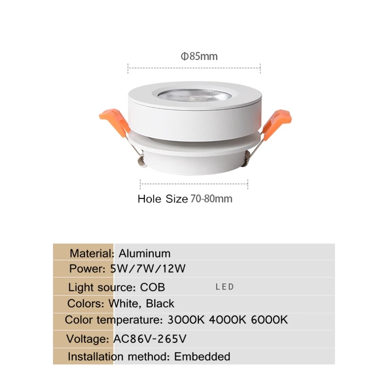 Вход напряжение: AC85 ~ 265V / 110V / 220V 50 / 60HzМощность: 5 Вт 7 Вт 12 ВтРегулировка яркости: без затемненияИндекс цветопередачи (CRI):> Ra90Угол луча: светодиодный 24 °Чип: COBСветовой поток: 95 ~ 110 лм/ВтТемпература: от-25 до 45 ° Степень защиты: Ie: теплый белый: (2700K-3000K); Натуральный белый: (4000K-4200K); Холодный белый: (6000K-6500K)Срок службы: 50000 ~ 80000 часовСертификация: CE / RoHS / FCC / 3CГарантия: 4 годаP42Цветовая температураМатериал: литой алюминий + линзы Происхождение: Гуандун (Китай)Особенности продукта