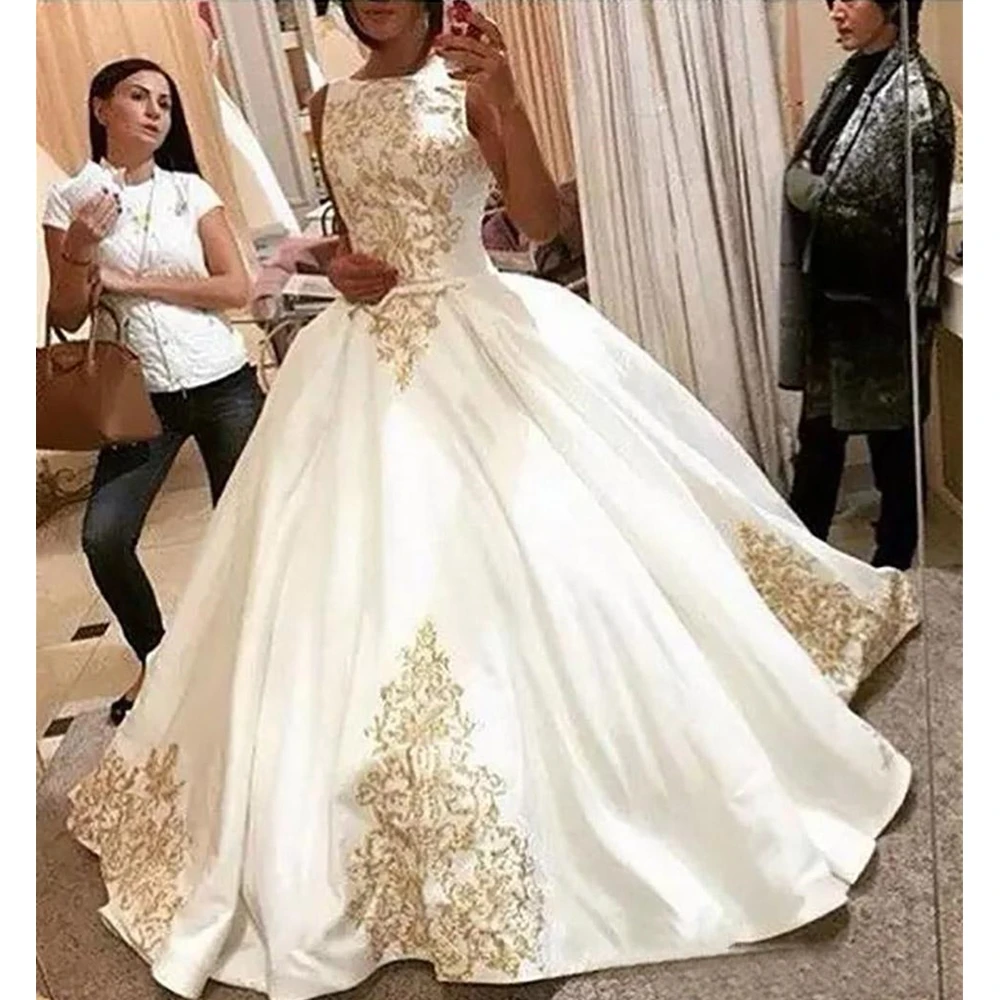 Великолепные Свадебные платья цвета слоновой кости трапециевидной формы с золотой аппликацией без рукавов, свадебные платья с круглым вырезом размера плюс