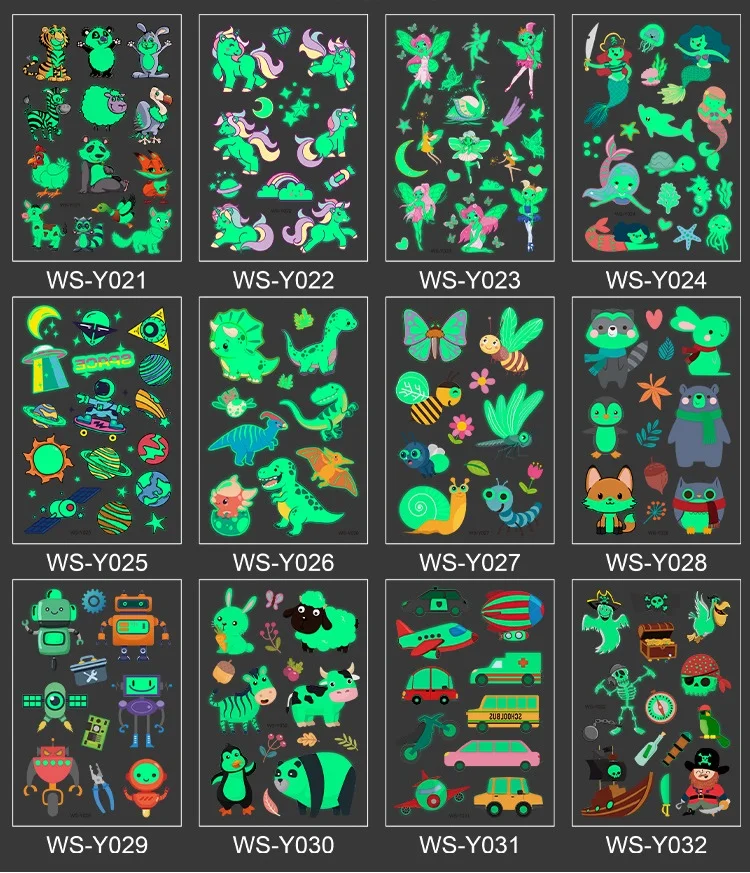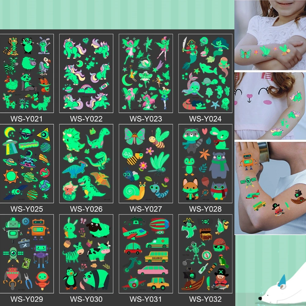 Светящаяся татуировка для Хэллоуина, 12 видов, мультяшный пират, единорог, временная наклейка для тела, одноразовая водостойкая татуировка, временная татуировка