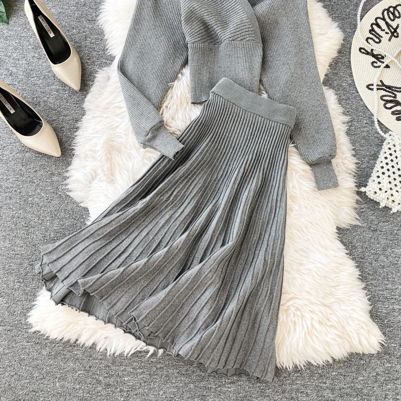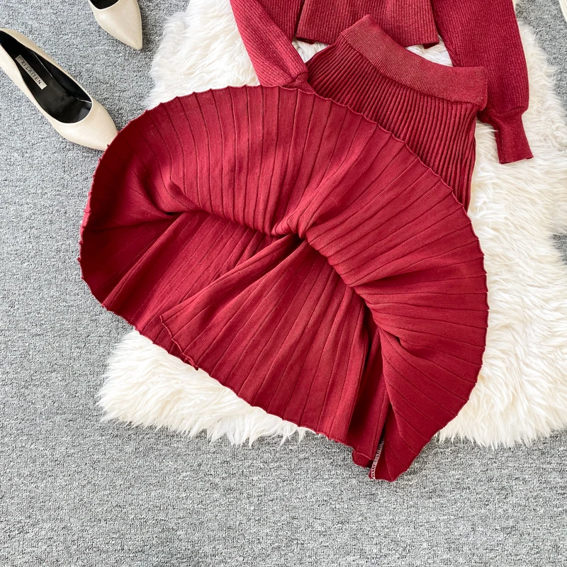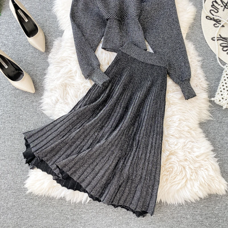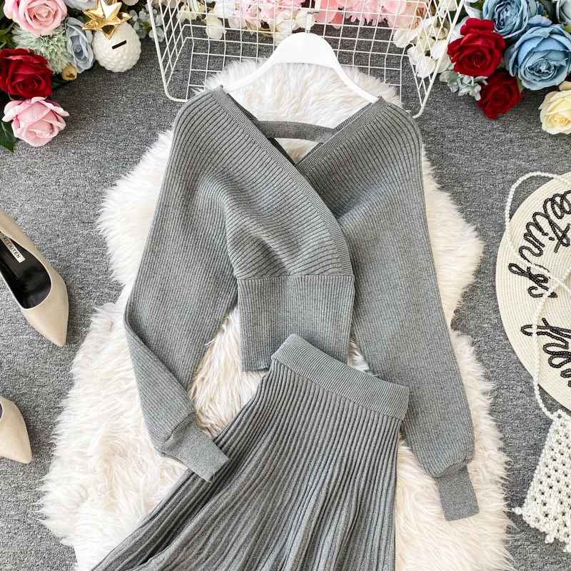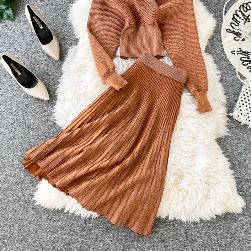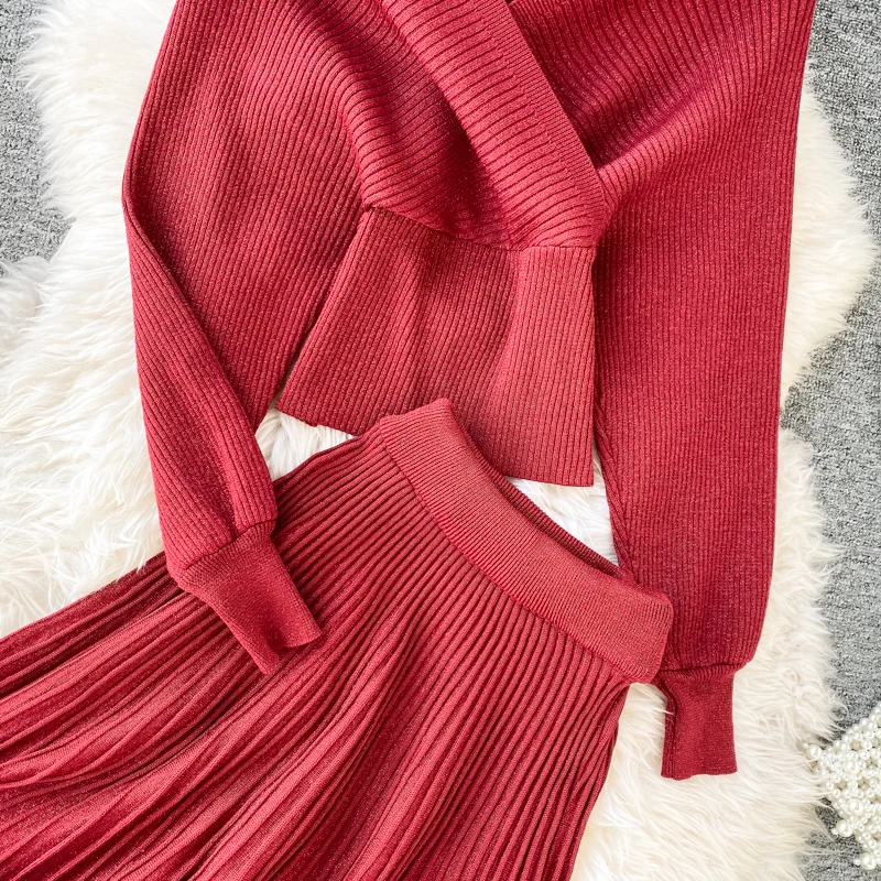 Croysier зимний костюм женский из двух частей, свитер топ с v-образным вырезом и плиссированная юбка миди, женские вязаный трикотажный костюм из 2 предметов, осенняя одежда, наряды для женщин трикотаж