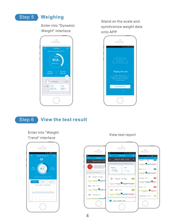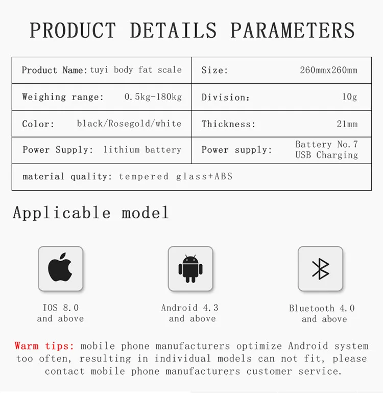 1)100% новое качество!2) больше сюрпризов ждут вас!3) весы, весы для здоровья, ваш домашний контроль здоровья стюард.4) Подключение по Bluetooth позволяет легко видеть физическое состояние себя и вашей семьи.Как измерение влияет на моего ребенка во время беременности?Жир используется биоэлектрическое сопротивление для измерения различных компонентов тела. Безопасно проходить через тело микротоки. Тем не менее, поскольку беременная женщина чувствительна, рекомендуется тестировать такие показатели, как уровень жира в организме после родов. Вы можете носить обувь во время беременности, чтобы выполнить тест веса.Для людей:Жир подходит для людей в возрасте 7-99 лет. Людям с медицинскими устройствами, такими как кардиостимуляторы, не разрешается использовать этот продукт! Беременные женщины должны использовать его с осторожностью и следовать советам вашего врача!Следующие люди могут иметь большие ошибки в использовании, и только информация о весе является точной:Взрослым/пожилым людям/лихорадка из-за простуды/больным искусственным диализом/остеопорозом с очень низкой плотностью кости/больным отеком/людям с такими занятиями, как фитнес или физические упражнения (или подобные)Выберите время измерения правой стороны:Рекомендуется держать тест одновременно и при одинаковых условиях каждый день, делать измерения каждое утро натощак или через два часа после еды, и пить, купать, тренировка, питание и т. д. повлияют на ваш тест.Старайтесь избегать таких ситуаций, чтобы произвести измерения:1. После напряженных упражнений2. После сауны или ванны3. После принятия много воды или еды4. После сильного питьяСпецификация:Размер изделия: 26*26 смПитание: 3a 2 * AAA батареи (не входят в комплект)Посылка включает в себя:1 x весовая шкалаПримечания:1) из-за разницы между различными мониторами изображения могут не отражать фактический цвет изделия.2) сравните размеры с вашими, пожалуйста, учитывайте погрешность в 1-3 см из-за ручного измерения.3) Пожалуйста, оставьте сообщение, прежде чем давать плохие отзывы, если у товара есть какие-то проблемы.Спасибо за понимание.
