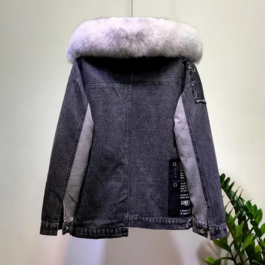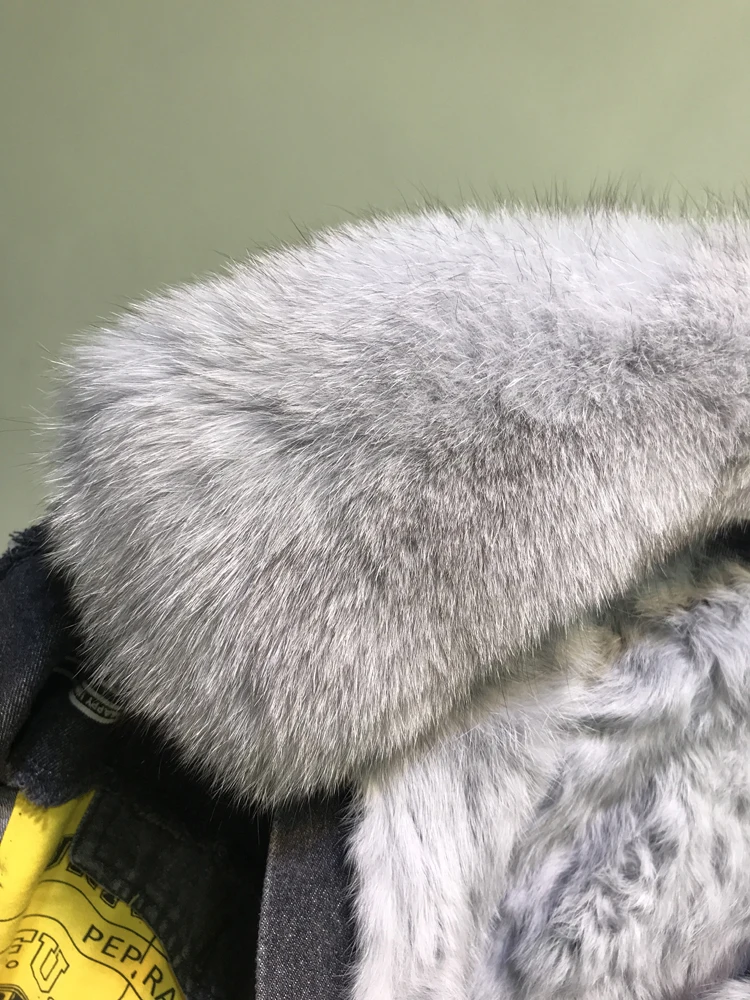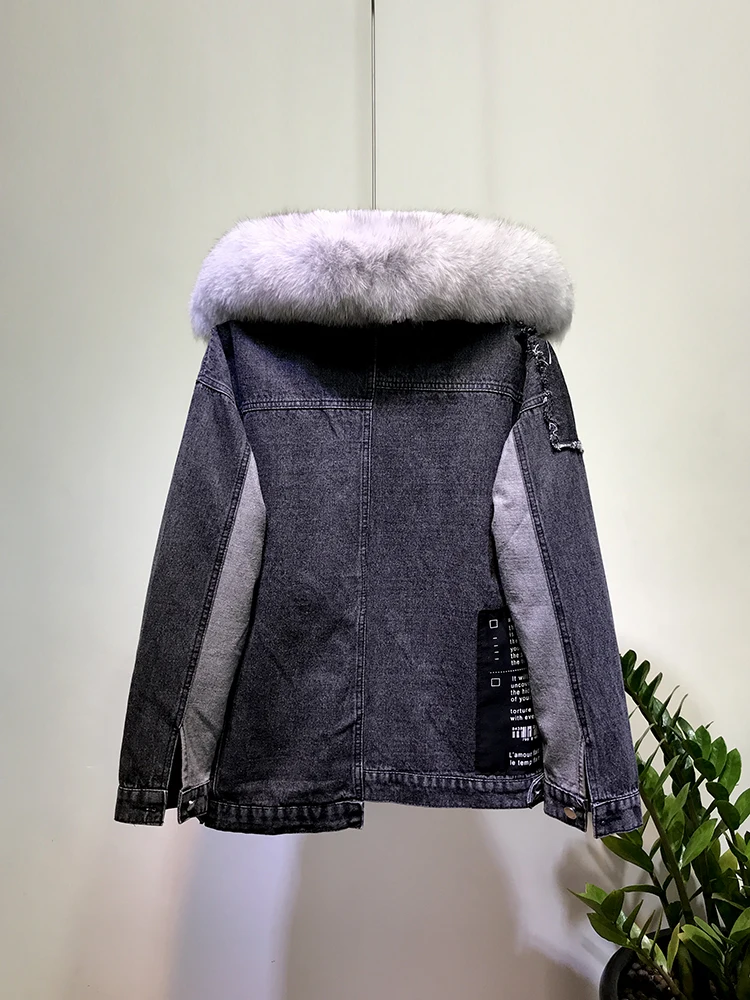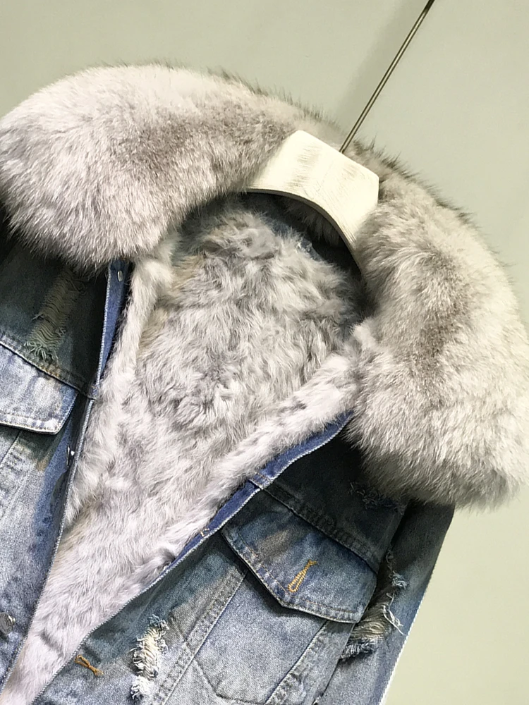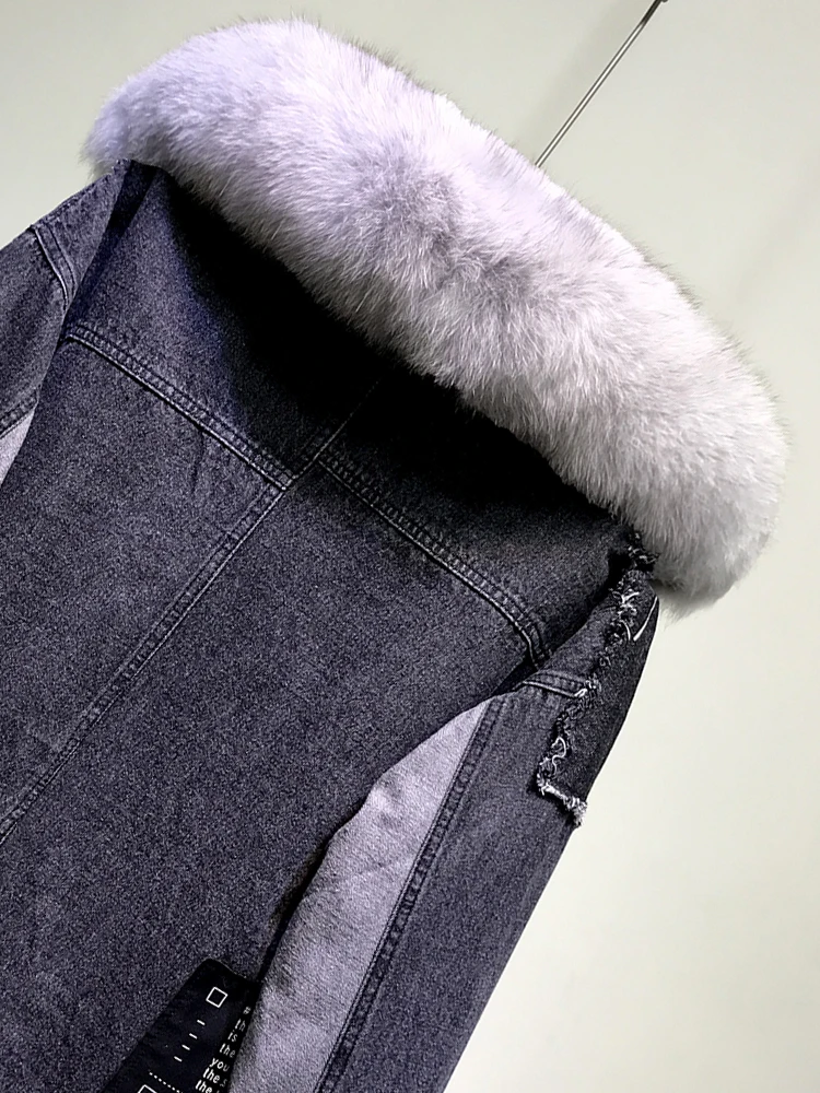 Это пальто с воротником из натурального Лисьего меха отличного качества Пушистая подкладка из натурального кроличьего меха делает его более модным и теплым. Если вам нравятся эти джинсовые пальто из настоящего меха, пожалуйста, сделайте заказ в ближайшее время, это станет отличным подарком для себя в холодную зиму.