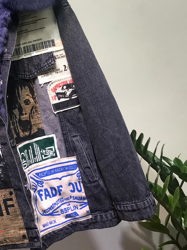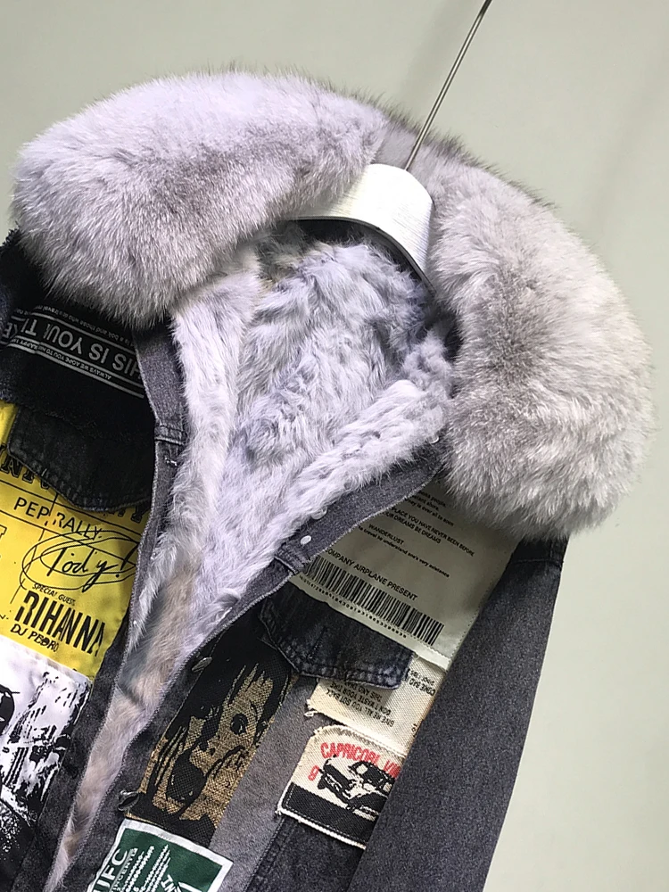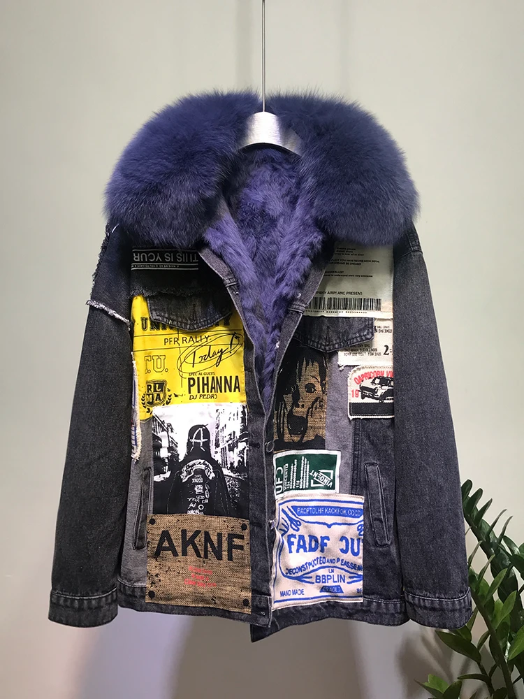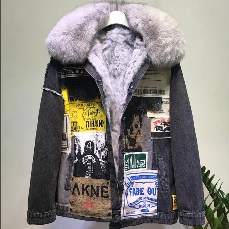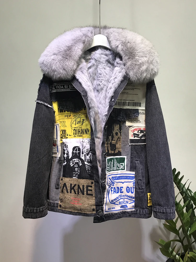 Женская джинсовая куртка с принтом, теплая куртка из натурального меха лисы и подкладка из кроличьего меха, с мультяшным принтом, для зимы, F2271