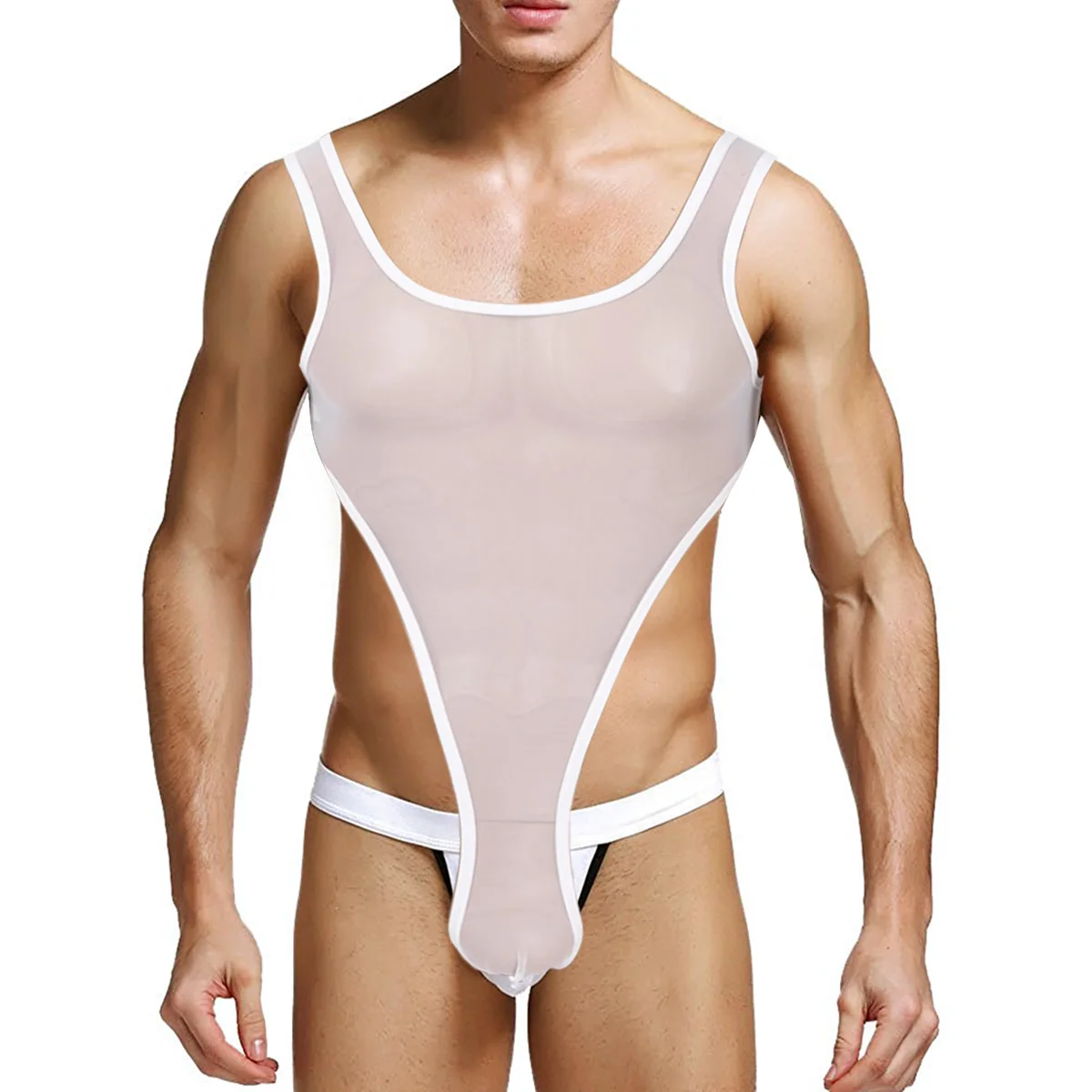 Мужской слитный купальник, пикантный прозрачный Прозрачное нижнее белье в сетку боди, купальник с глубоким U-образным вырезом, без рукавов, с высоким вырезом, трико