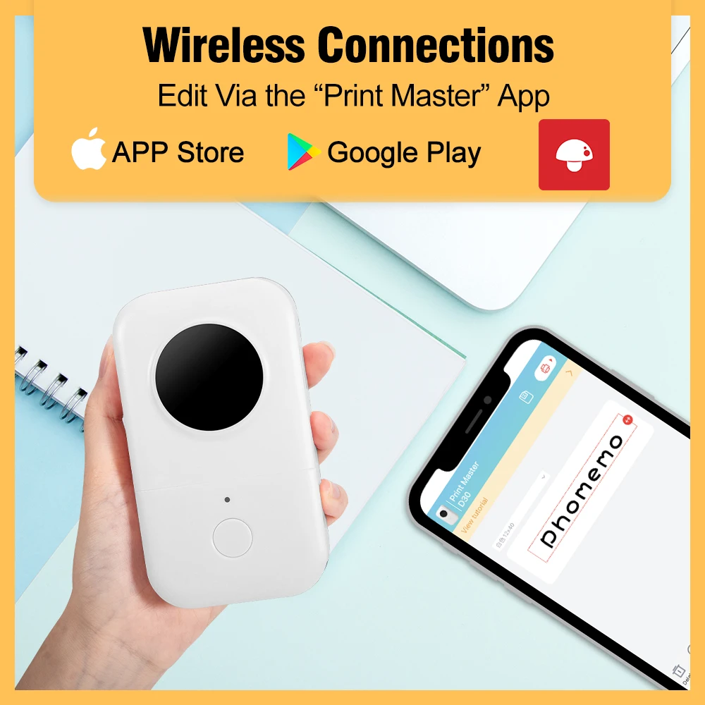 Phomemo D30 термальный принтер этикеток беспроводное соединение и использование технологии термопечати, которые не являются чернилами или тонером. Система для Android 4,0 и IOS 8,0 или выше. Мини портативный размер (131,1x75,5x29 мм) и всего 160 г, который можно легко взять в любом месте. Черный на белых печатных принтах. Можно напечатать на прозрачных лентах этикеток.