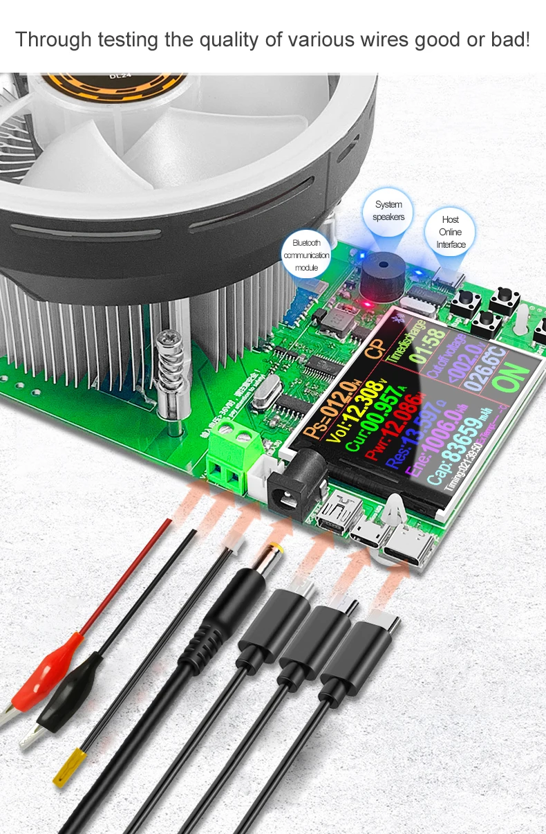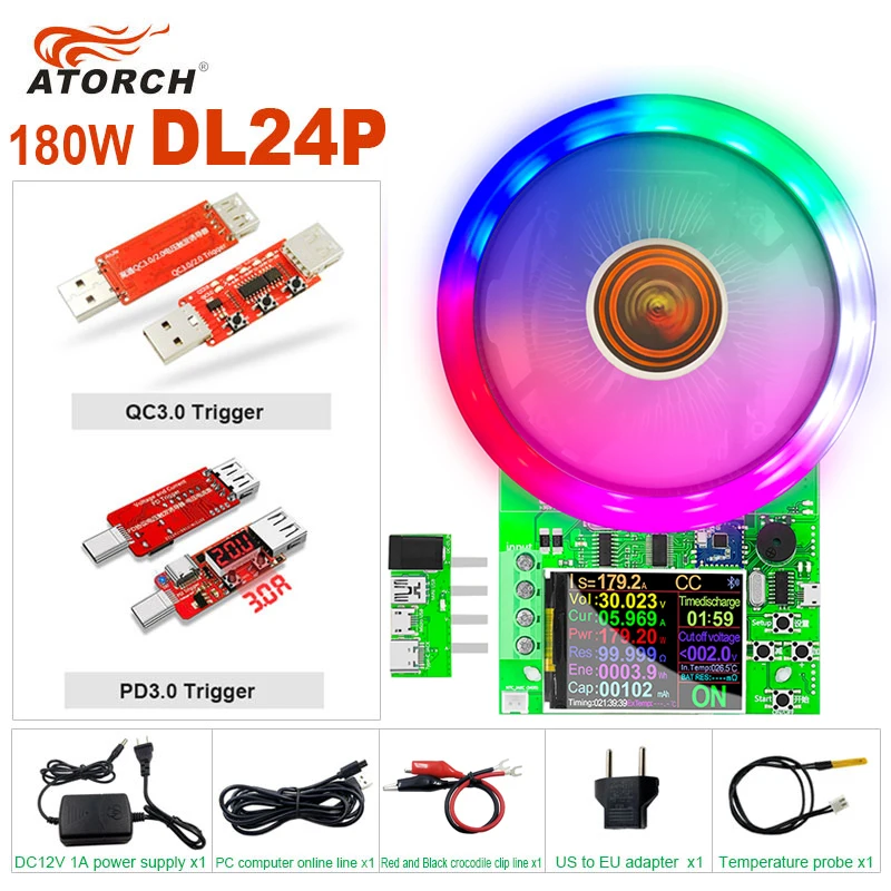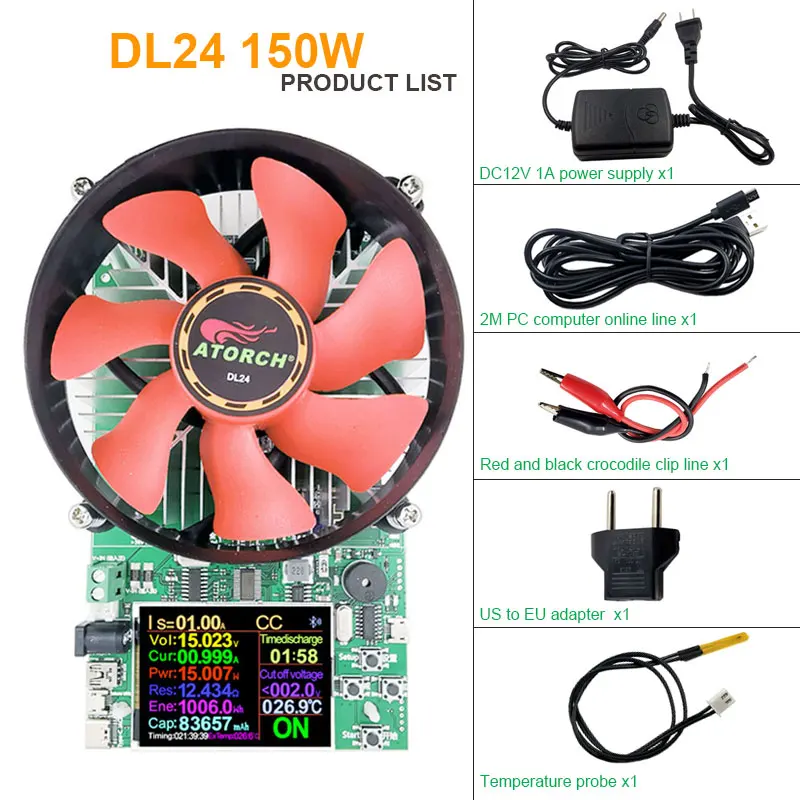 1.DL24 / DL24P цветной дисплей Bluetooth цифровой контроль кривая версия нагрузки Tesr x12. Источник питания DC12V 1A x13,2 м ПК компьютер он-лайн линия x14. Датчик температуры x15. Красная и черная одиночная линия крокодил клип линия x16. Адаптер США в ЕС x1