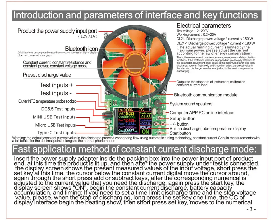 Электрические параметрыИспытательное напряжение: 2 ~ 200 вРабочий ток: 0,2 ~ 20ADL24 разрядная мощность: напряжение * ток <150 ВтDL24P разрядная мощность: напряжение * ток <180 Вт(Фактический ток тока ограничен максимальной мощностью, пожалуйста, настройте ток в соответствии с законом энергосбережения)Встроенные функции защиты от перегрузки по току, перегрева, перегрузки по мощности, если интерфейс защиты выскочит, пожалуйста, обратите внимание на настройку параметров, настройте на максимум Мощность, а затем разрядка, вы можете сначала медленно и плавно отрегулировать заданное значение в начале и разрядке, чтобы настроить до максимальной мощности для Разрядка