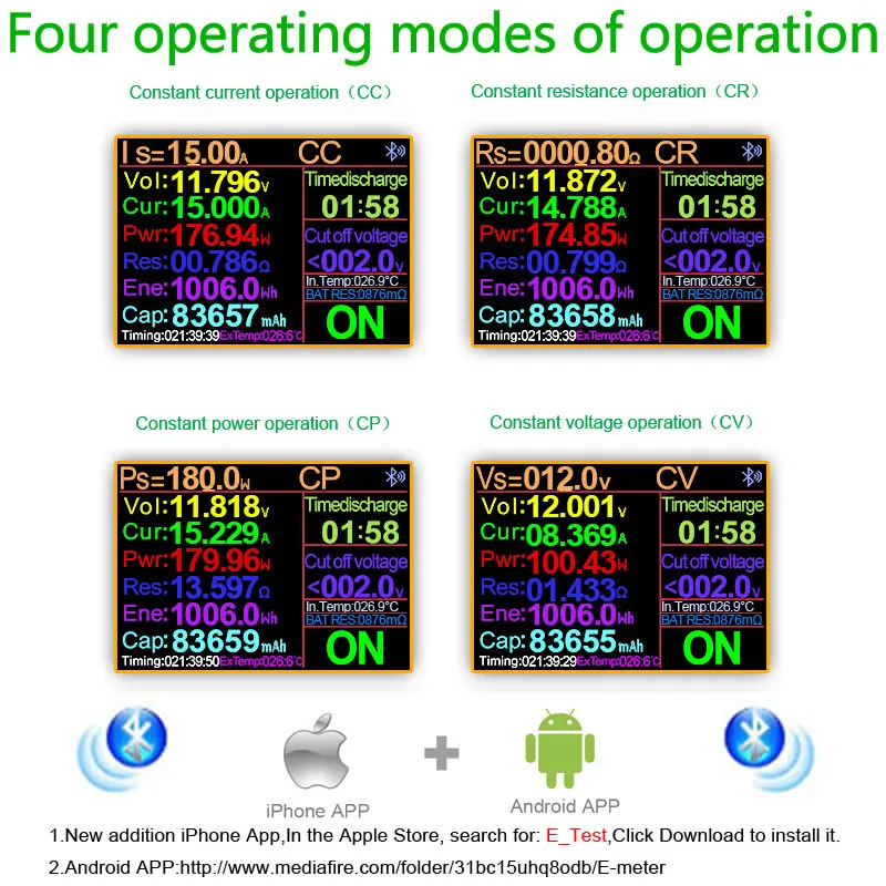 Пожалуйста, найдите E_test в магазине приложений для загрузки и установки, затем нажмите значок приложения Bluetooth, чтобы открыть программное обеспечение, А затем нажмите на значок Bluetooth над программным обеспечением, чтобы войти в DL24-BLE выбора для подключения, вы можете получить мобильный телефон с дистанционным беспроводным пультом дистанционного управления и функцией измерения, Состояние разряда можно просмотреть в любое время на мобильный телефон, видны различные очистки данных, кривая напряжения и тока разряда и т. Д.