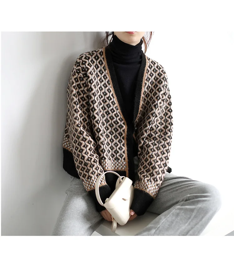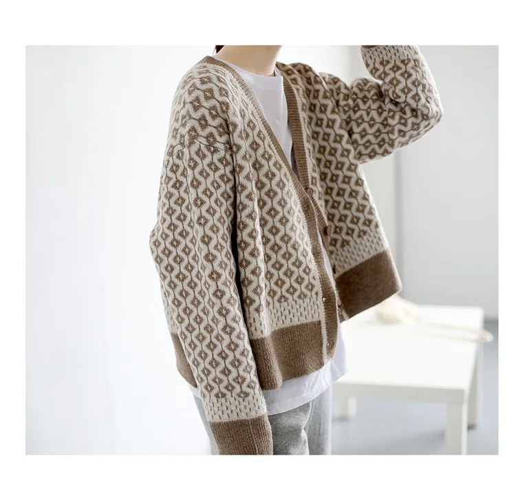 Женский вязаный кардиган с ромбиками, винтажный короткий свитер с V-образным вырезом, Свободный кардиган, Осень-зима 2021