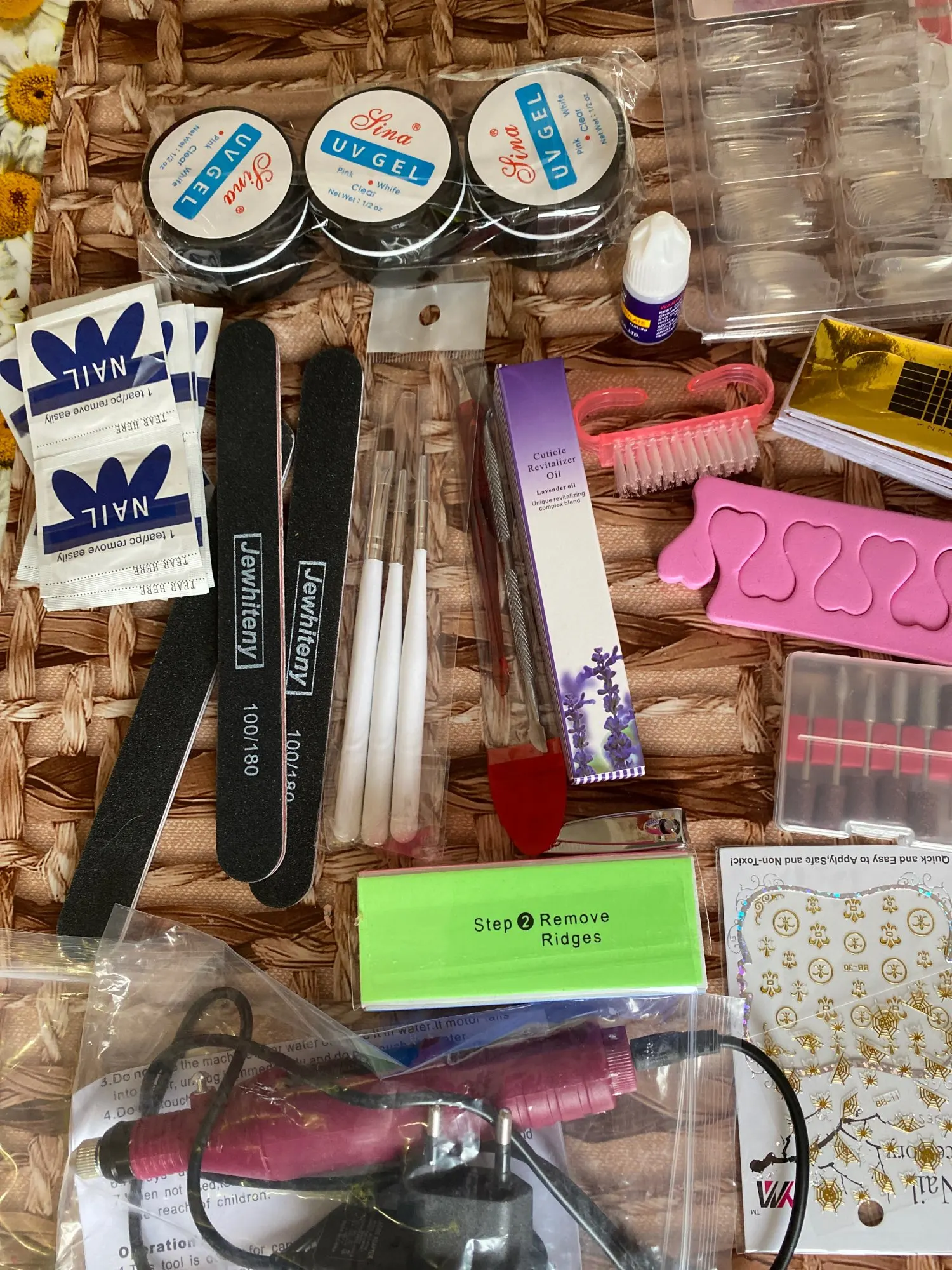 Замечательный набор! Для новичков есть всё что нужно для маникюра. Я очень довольна приобретённым набором. Лампа и машинка работают, всё отлично. Лаки все целые не пролились. Упаковано очень хорошо. Доставка в Украину два месяца. На вопросы продавец отвечает сразу. Рекомендую и товар и продавца. Спасибо за работу.