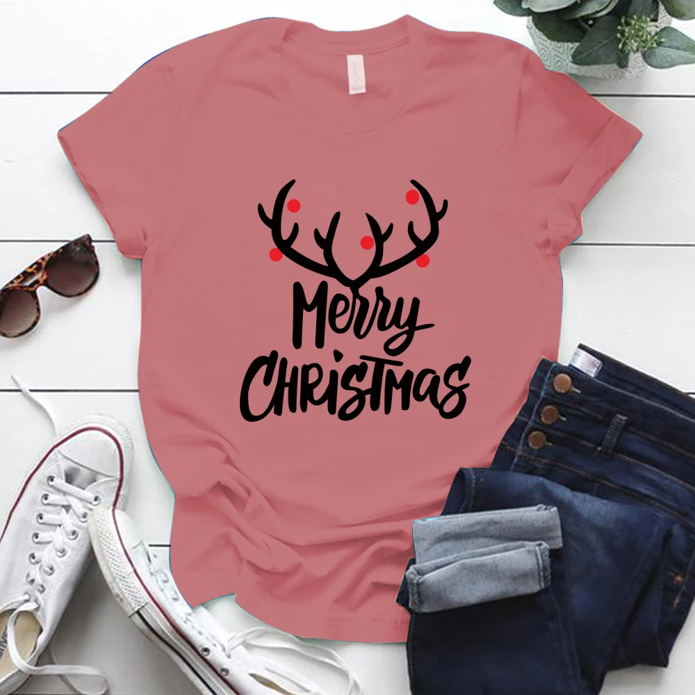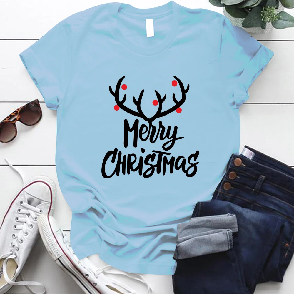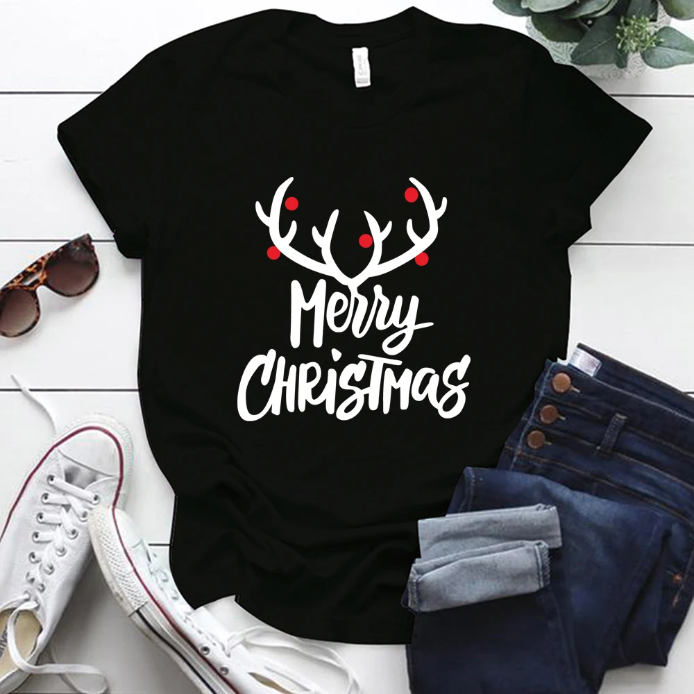 Женская футболка в стиле Харадзюку с коротким рукавом и круглым вырезом, футболка большого размера с принтом рогов на Рождество, Размеры S-xl, Ropa Mujer