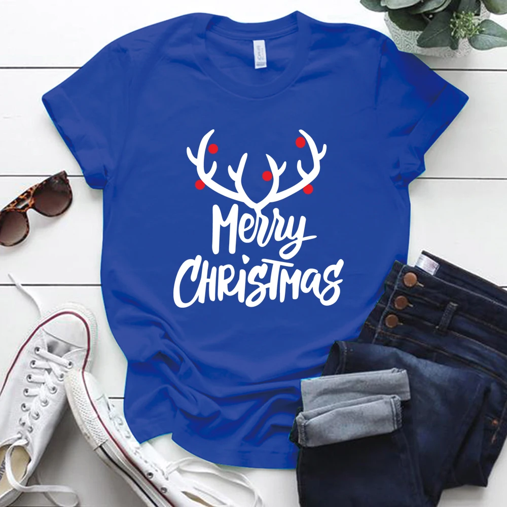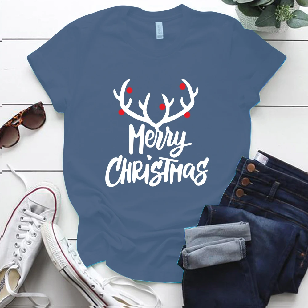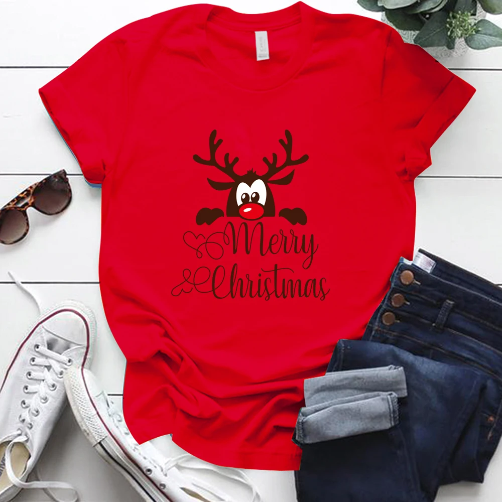 Merry принт с рождественским лосем женские футболки с коротким рукавом, S-5xl хлопок, футболка оверсайз, праздничный подарок для дам, топы, футболки женские
