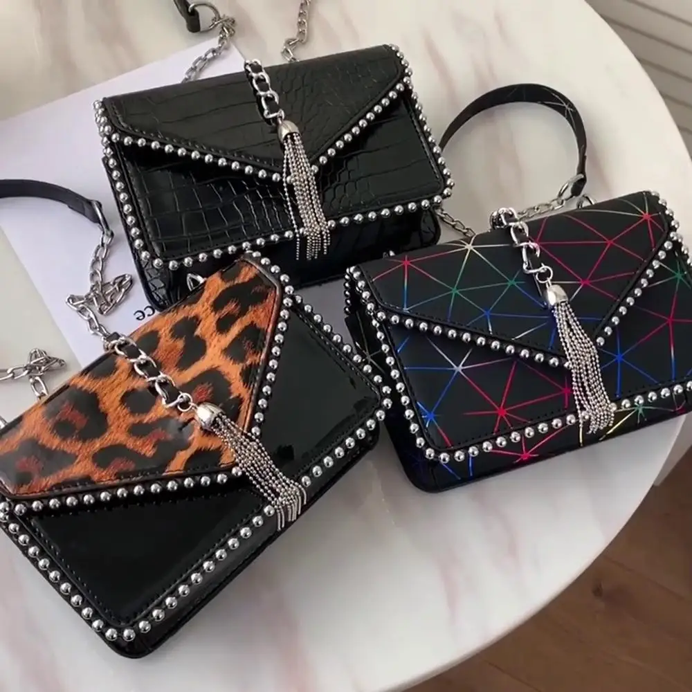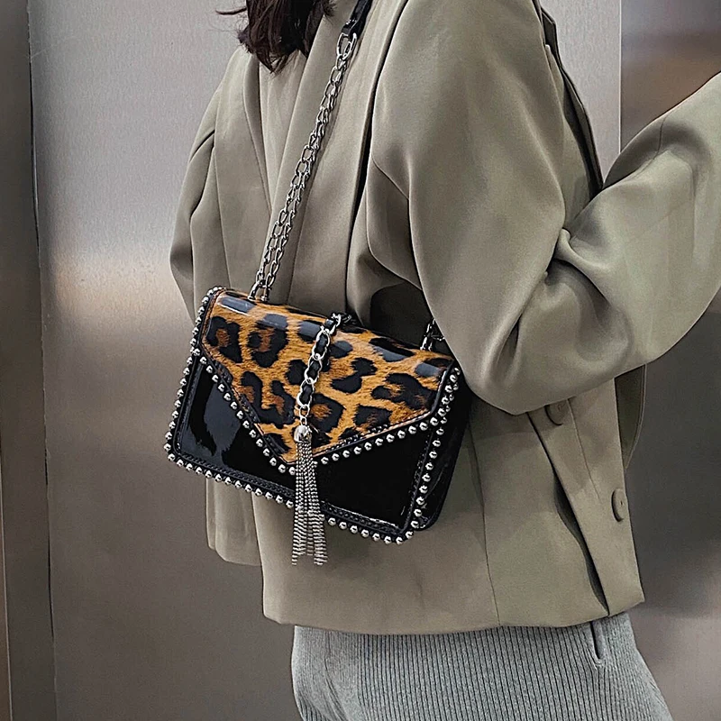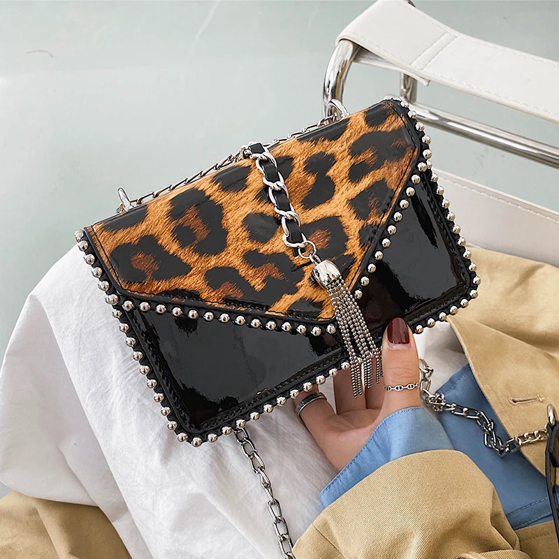 Женская сумка-мессенджер из лакированной кожи с леопардовым узором и цепочкой через плечо