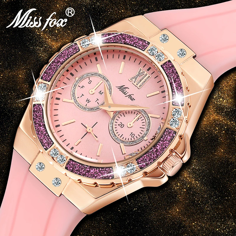 MISSFOX женские кварцевые часы с розовым каучуковым ремешком спортивные модные часы с японским механизмом женские наручные часы новое поступление 2020 Описание: -Стиль: модный роскошный брендовый стиль -Популярные бренды из Женевы, Швейцария -Абсолютно новые и высококачественные товары. -Точный кварцевый часовой механизм, показывающий правильное время. -Водонепроницаемость до 30 м (не подходит для принятия душа или купания). -Невыцветающее вакуумное нанопокрытие 18-каратным золотом. -Подарок на Рождество, можно надеть на годовщину, вечеринку, день рождения или на свидание. Характеристики (прибл.): Диаметр корпуса: около 36 мм Толщина корпуса: около 0,8 см Материал корпуса: нержавеющая сталь Ширина браслета: 1.8 см Длина браслета: прибл. 22 см (может быть изменена по вашему запросу) Материал браслета: Рафинированный сплав и нержавеющая сталь Регулировка длины браслета: нет Посылка входит: 1 x оригинальные часы MISSFOX