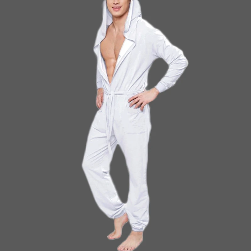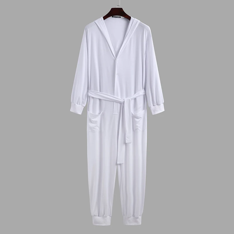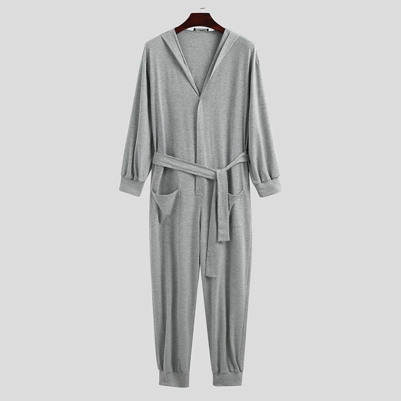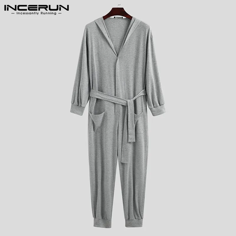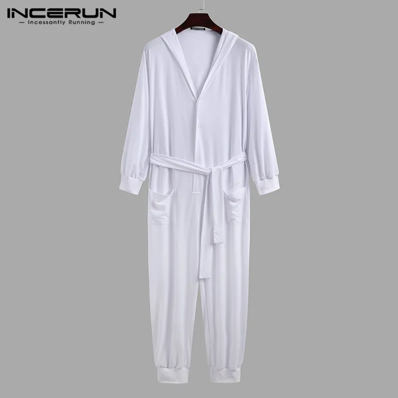Однотонные Комбинезоны для отдыха, одежда для сна, INCERUN, мужские комбинезоны на кулиске с длинными рукавами, пуговицами и капюшоном, ночная рубашка, свободные карманы, домашняя одежда 5XL