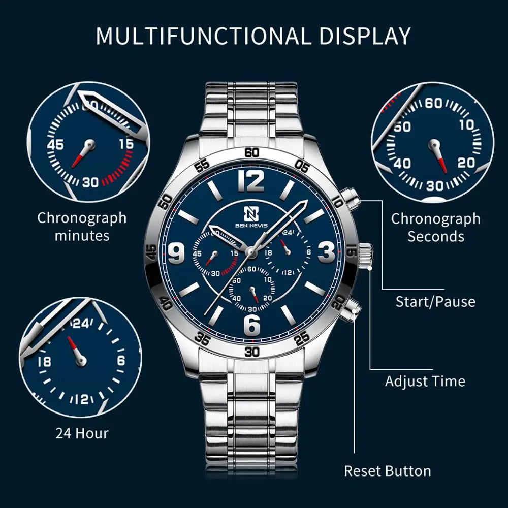 Бен Невис хронограф наручные часы человек Элитный бренд Для мужчин часы Сталь кварцевые часы с кожаным ремешком Бизнес часы мужской ящик для инструментов BN6010G