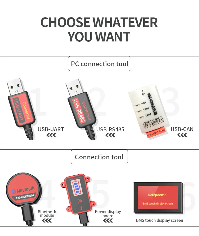 Бесплатные детали, как показано ниже1) модуль Bluetooth2) usb-кабель UART3) Кабель USB к RS485 (только для модуля RS485 /CAN)4) датчик температурыНужна дополнительная покупка1) сенсорный ЖК-экран2) индикатор заряда батареи