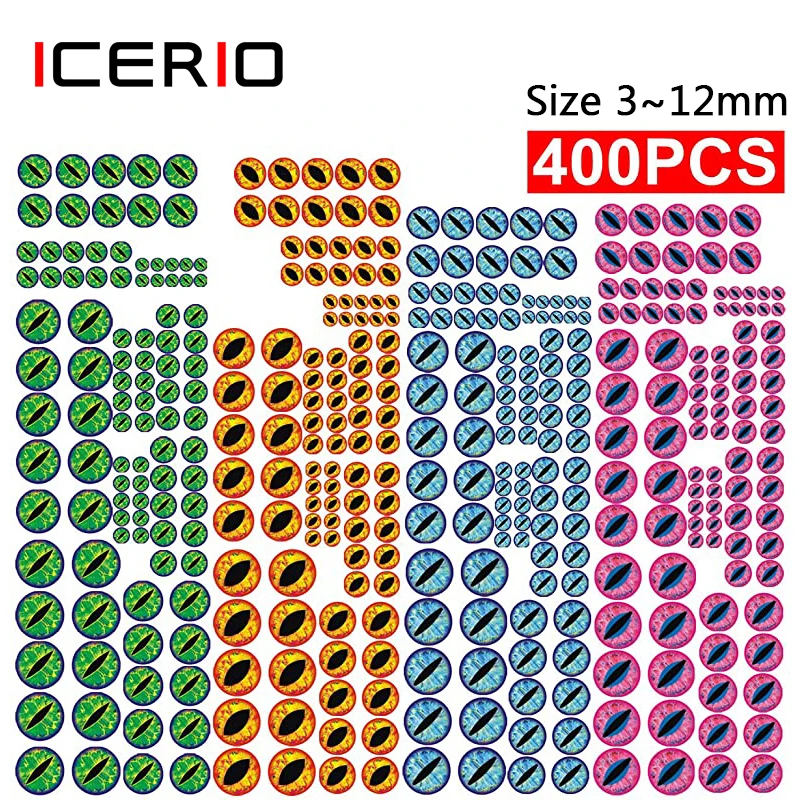 ICERIO 3D эпоксидные глаза рыбы, глаза Дракона, глаза раптилии для рыбалки, нахлыст, приманка для рыбы, 400 ассортимент, 3 мм до 12 мм