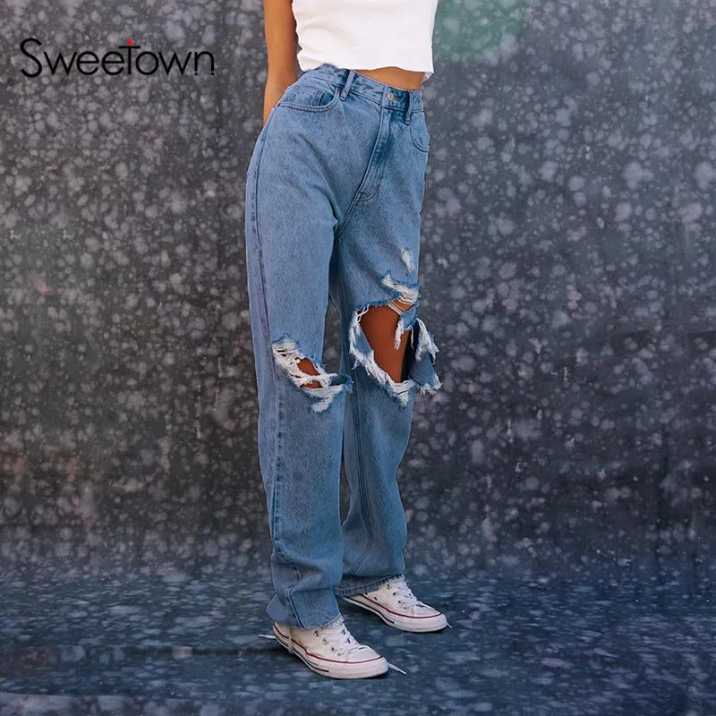 Sweetownженские прямые джинсы с потертостями, в консервативном стиле, 90s, уличная одежда для девочек, повседневные свободные джинсы в стиле хип-хоп
