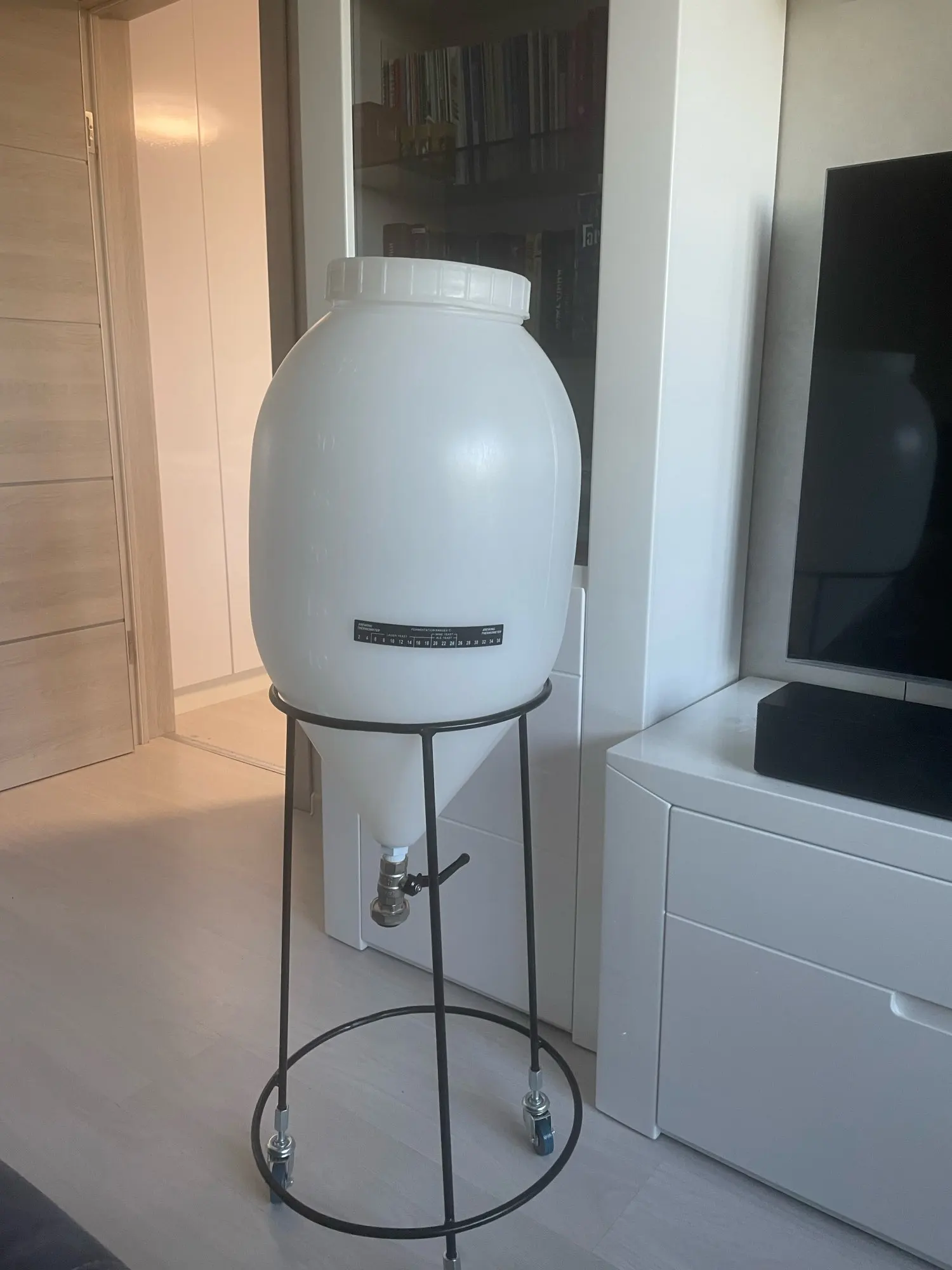 Устойчивая подставка из 10мм стали с металлическими вращающимися роликовыми колесами с прорезиненным покрытием , регулируемыми по высоте - удобна для перемещения ферментера.