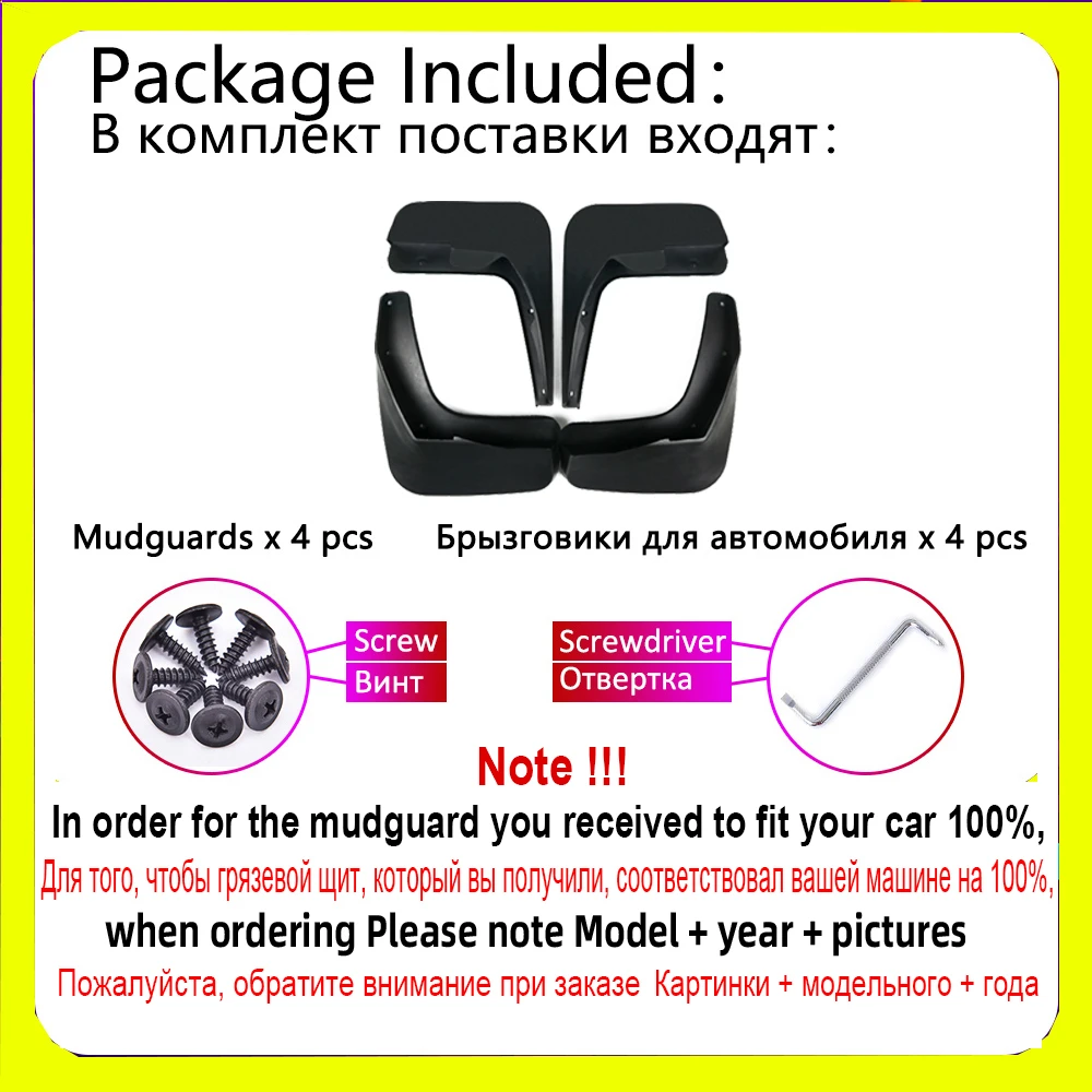 Эти износостойкие грязевые предохранители легко сочетаются с автомобилями и минимизируют риск попадания грязи, дорожных обломков и каменных сколов с передних и задних шин. Обеспечьте дополнительную защиту, улучшая спортивный внешний вид вашего автомобиля Инструкции по установке: 1. Автомобиль в нижней части оригинальных винты для автомобилей с гаечным ключом, чтобы отвинтить 2. Возьмите Брызговики, хорошее расположение, винты установлены 3. Винты установлены в соответствующем отверстии на брызговиках.