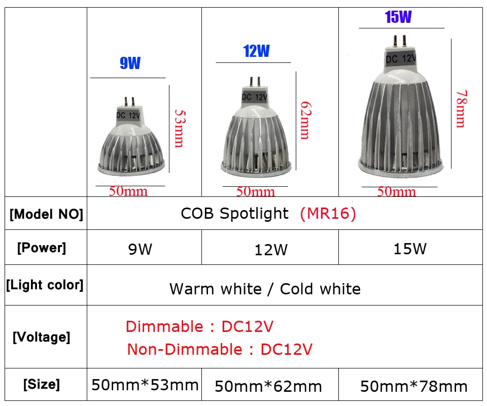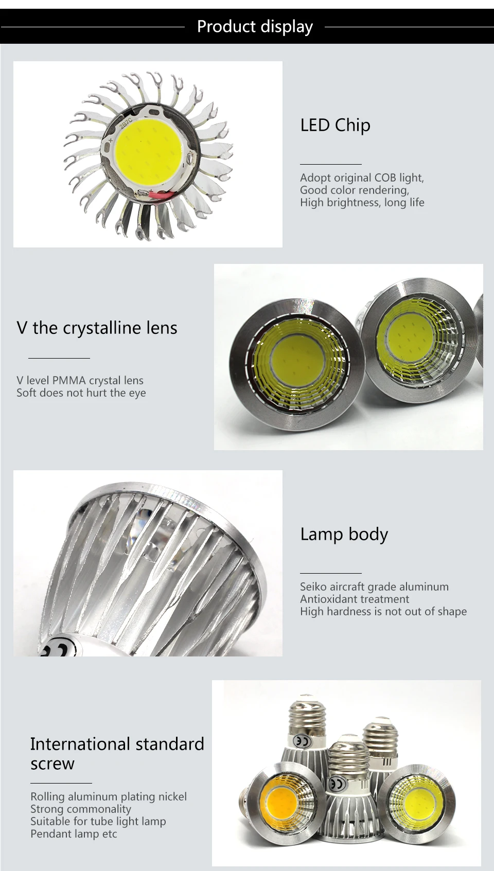 E27 E14 GU10 GU5.3 MR16 LED COB 9 Вт 12 Вт 15 Вт белыйтеплый белый точечный светильник, Диммируемый Точечный светильник, лампа постоянного тока 12 Встрогий светильник