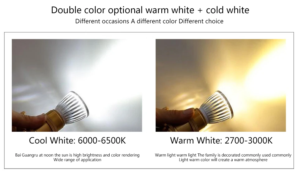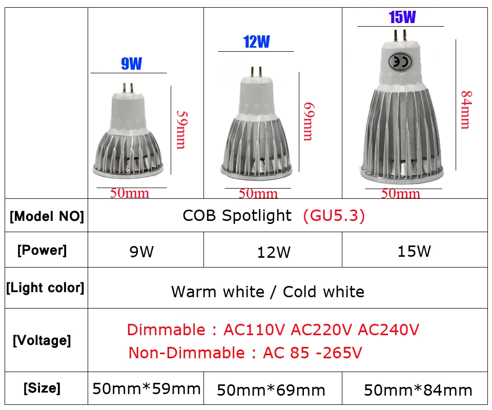 Dimmable Voltage:GU10/E27/E14/GU5.3 is AC110V or AC220V MR16 is DC12V