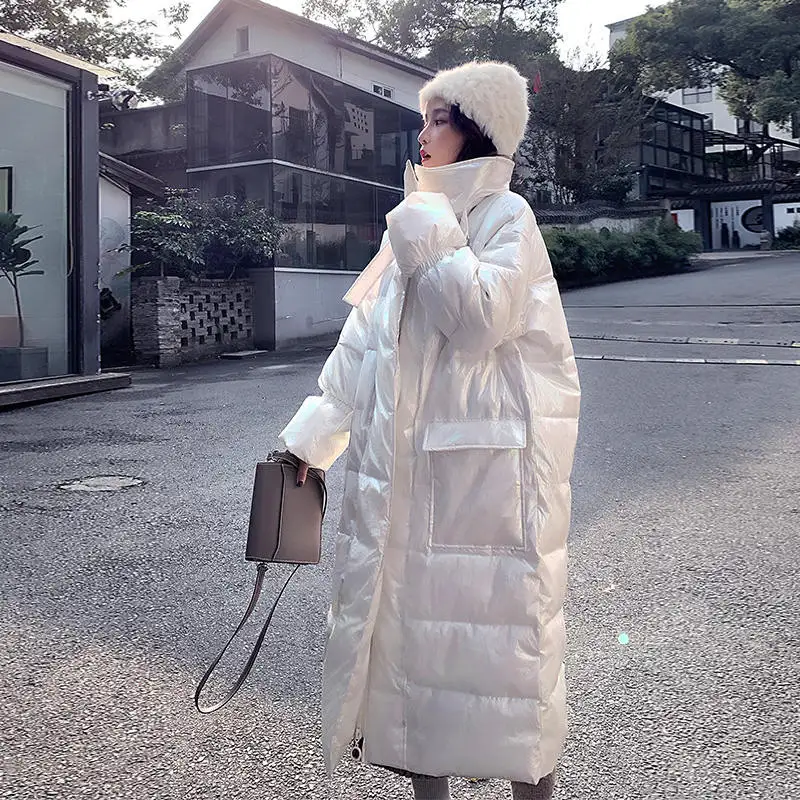 Белая черная блестящая зимняя куртка для женщин со стоячим воротником, свободное Женское пальто большого размера, теплое длинное пальто, пуховик, хлопковая куртка, парки, C6684
