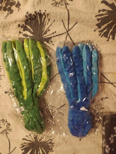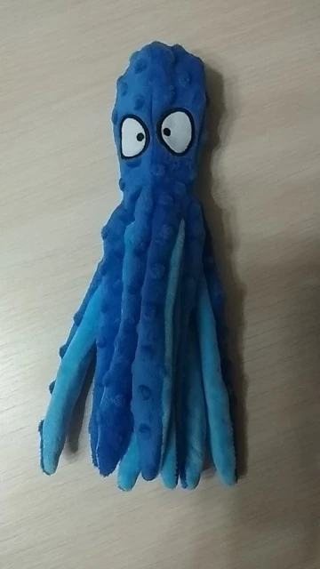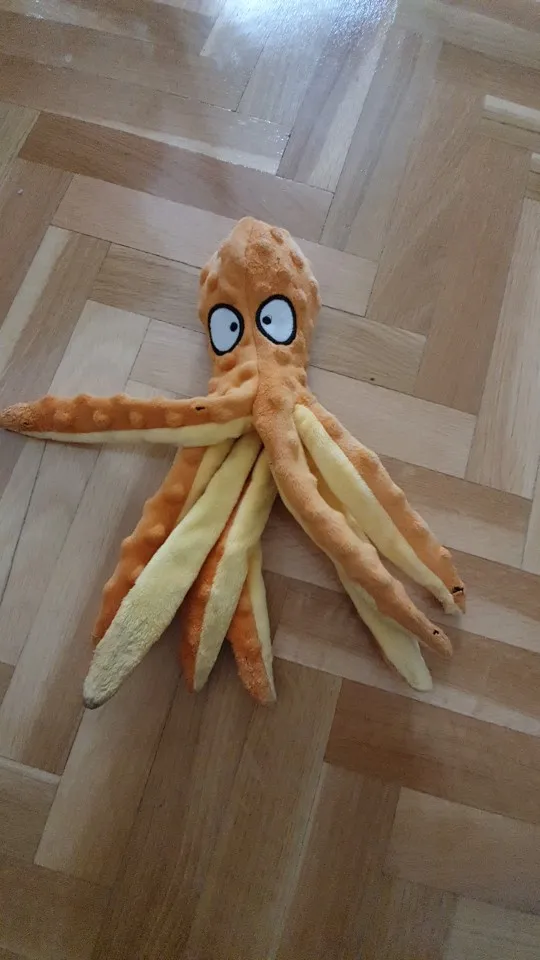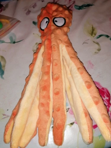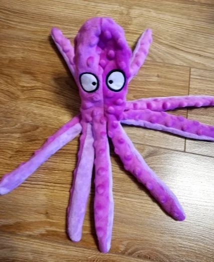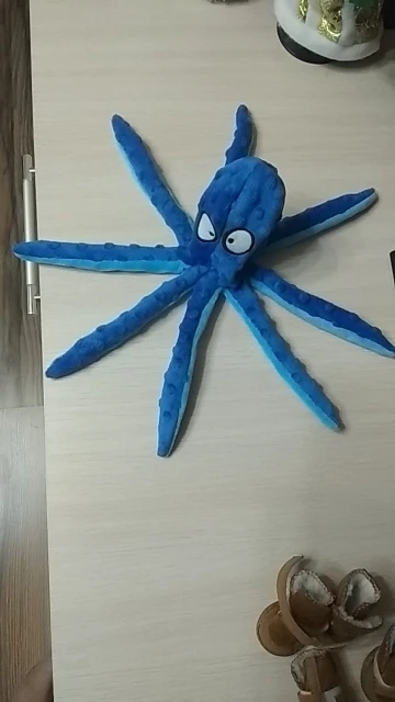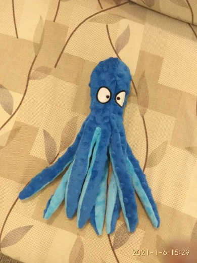 Шикарный осьминог))) Собака в восторге, достаточно большой, без наполнителя внутри, что большое преимущество, собачка не наестся того что не надо, все щупальца шерудят, внутри тельца есть пищалка, материал плотный, пошито качественно. Посылка приехала быстро, продавца рекомендую)