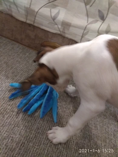 очень приятная игрушка, шуршащие щупальца, в голове пищалка, собака довольна!!
