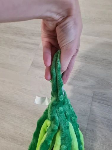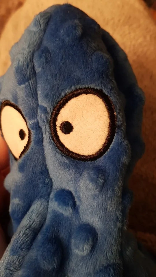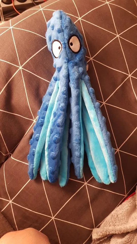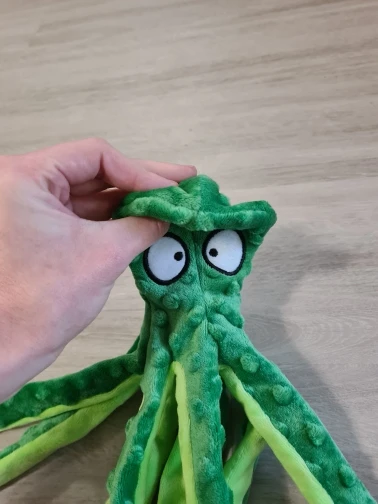 Осьминог очень хороший. Сшит аккуратно. Запаха нет. В голове пищалка, щупальца шуршат. Собака (корги) довольна! Спасибо продавцу за качественный товар и быструю доставку.