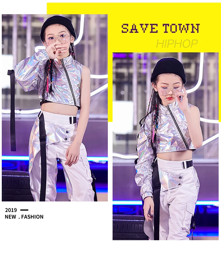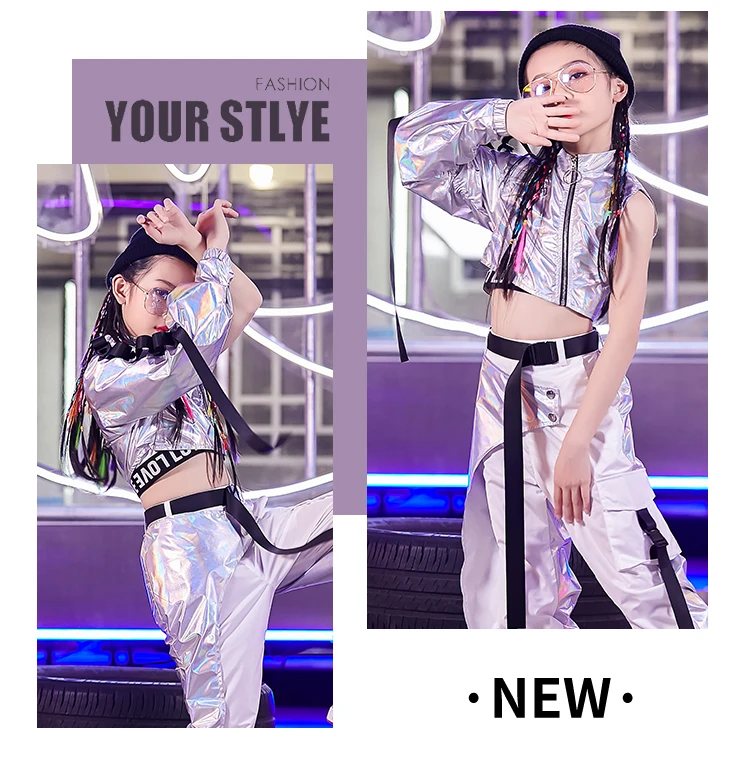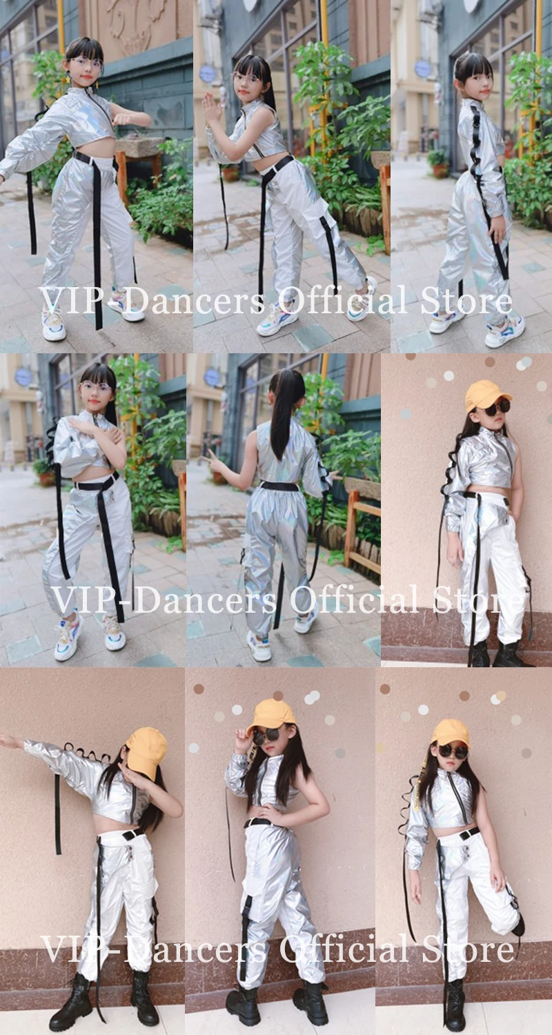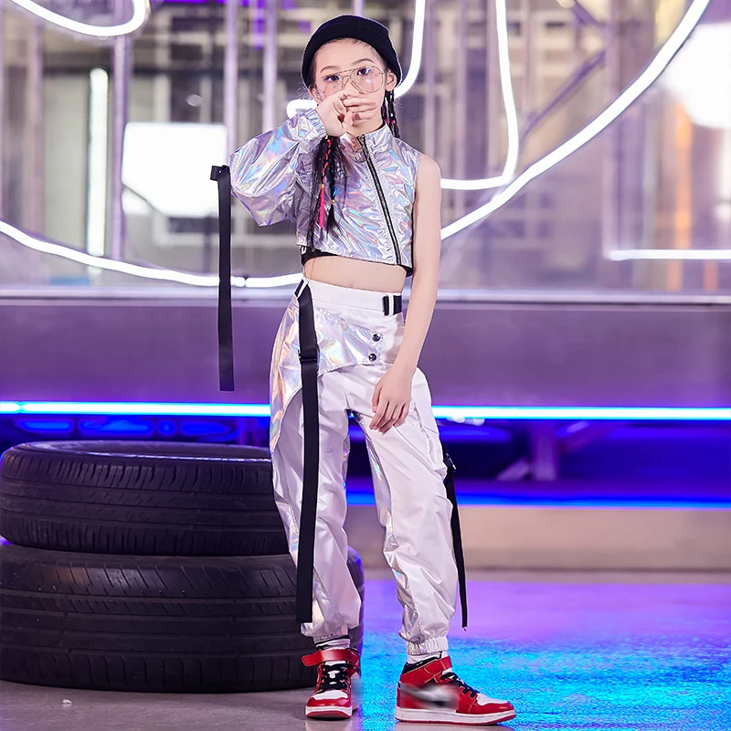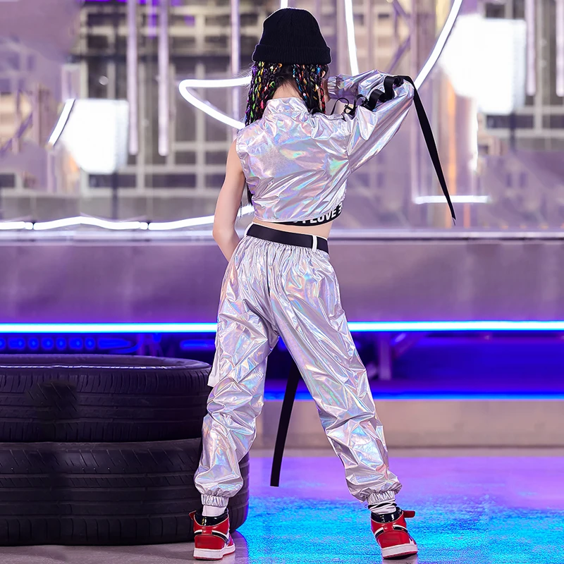 Модная Серебряная одежда в стиле хип-хоп для девочек, уличный танцевальный костюм, джазовые топы, свободные штаны, сценический костюм, наряд для бальных танцев