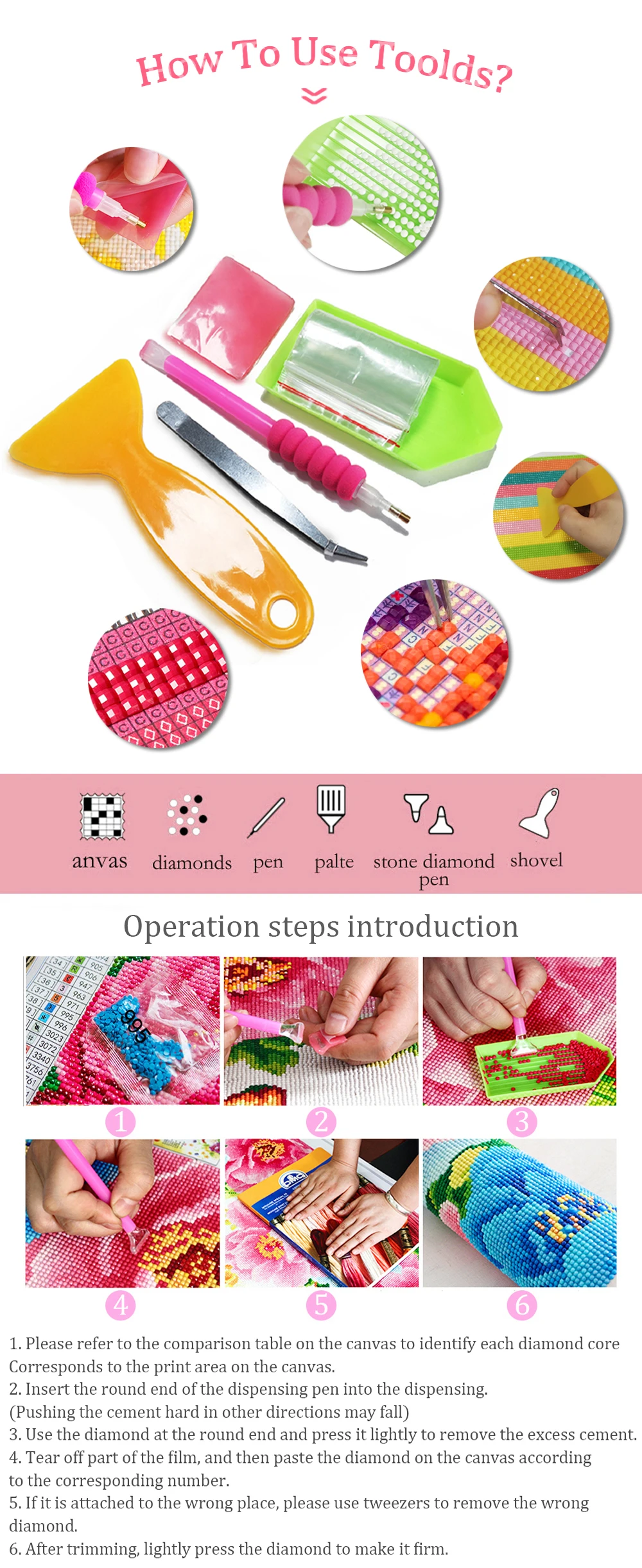 1. Пожалуйста, обратитесь к таблице сравнения на холсте для определения каждого алмазного сердечника Соответствует области печати на холсте 2. Вставьте круглый конец дозирующего пера в Дозирующее устройство. (Толкание цемента в других направлениях может упасть) 3. Используйте бриллиант на круглом конце и слегка нажмите на него, чтобы удалить излишки цемента. 4. Оторвите часть пленки, а затем вставьте алмаз на холст в соответствии с соответствующим номером. 5. Если он прикреплен не в том месте, пожалуйста, используйте пинцет для удаления неправильного алмаза. 6. После обрезки слегка нажмите на бриллиант, чтобы сделать его твердым.