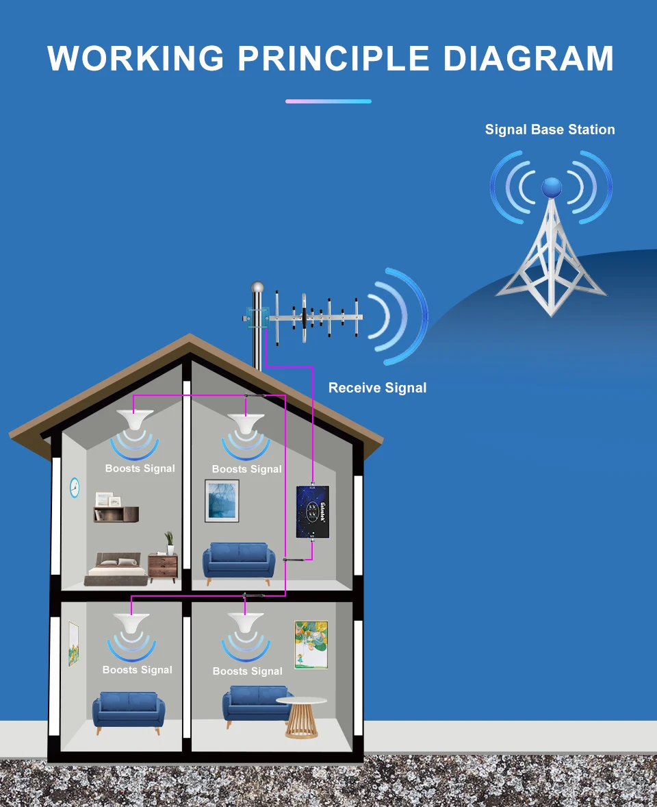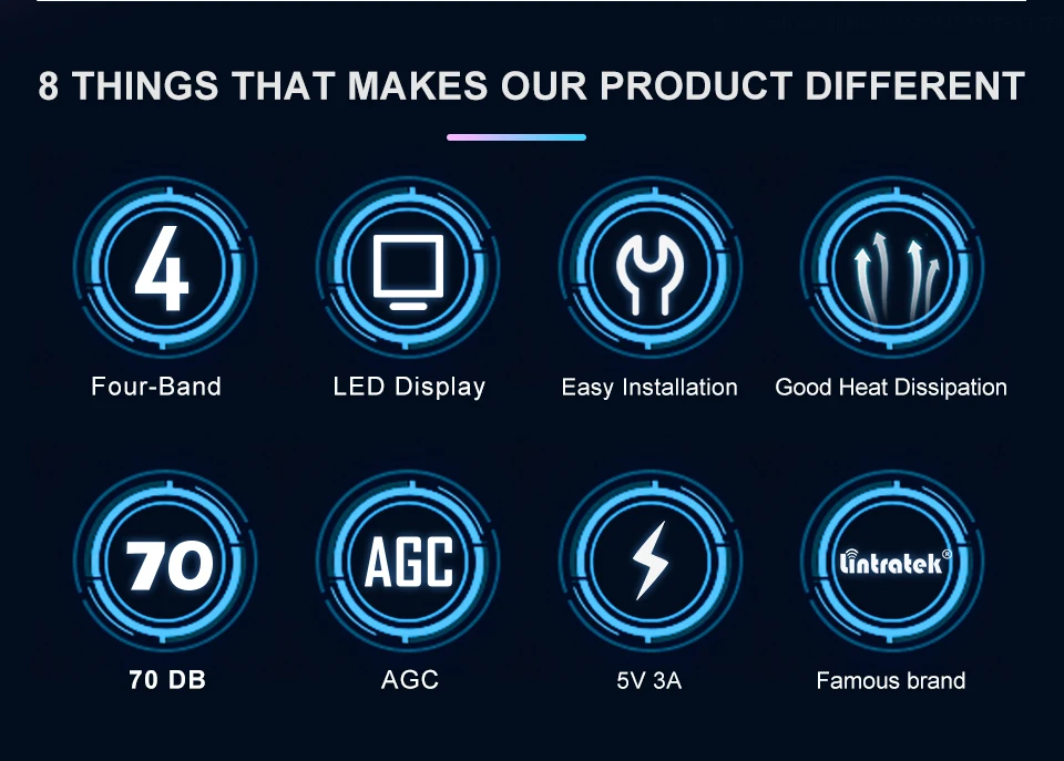 Это четырехдиапазонный усилитель сигнала, который работает на частоте 900, 1800, 2100 и 800 МГц, которые состоят из полосы 8, полосы 3, полосы 1 и полосы 20, охватывает практически все частоты сигнала, используемые в России, Европе и Азии.