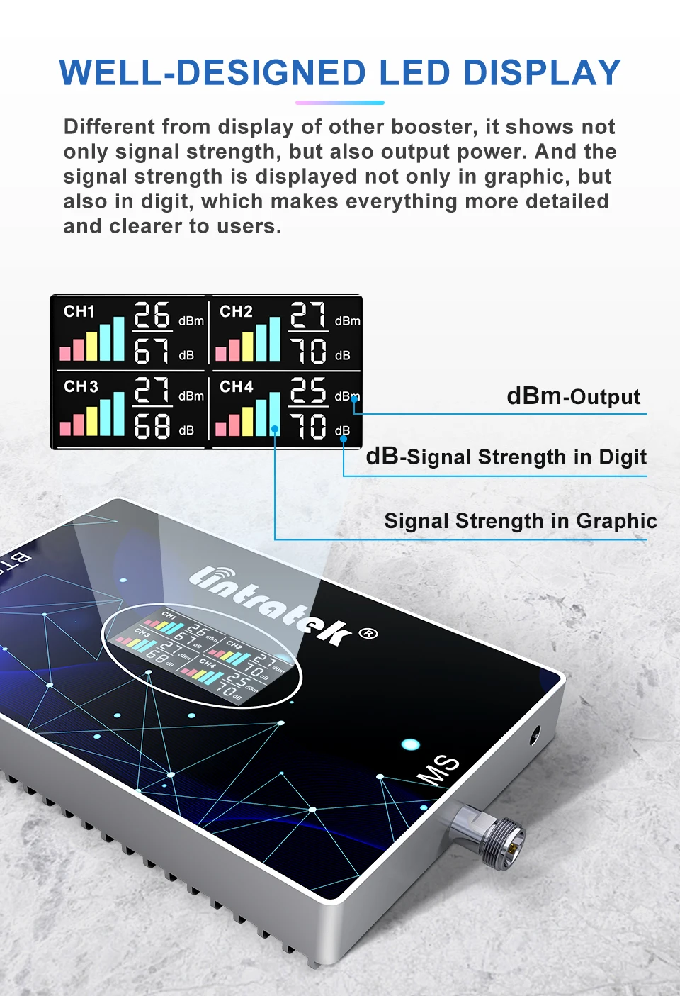Хорошо разработанный светодиодный дисплейВ отличие от дисплея другого бустера, он показывает не только силу сигнала, но и выходную мощность. А сила сигнала отображается не только в графике, но и в цифре, что делает все более детализированным и понятным пользователям.