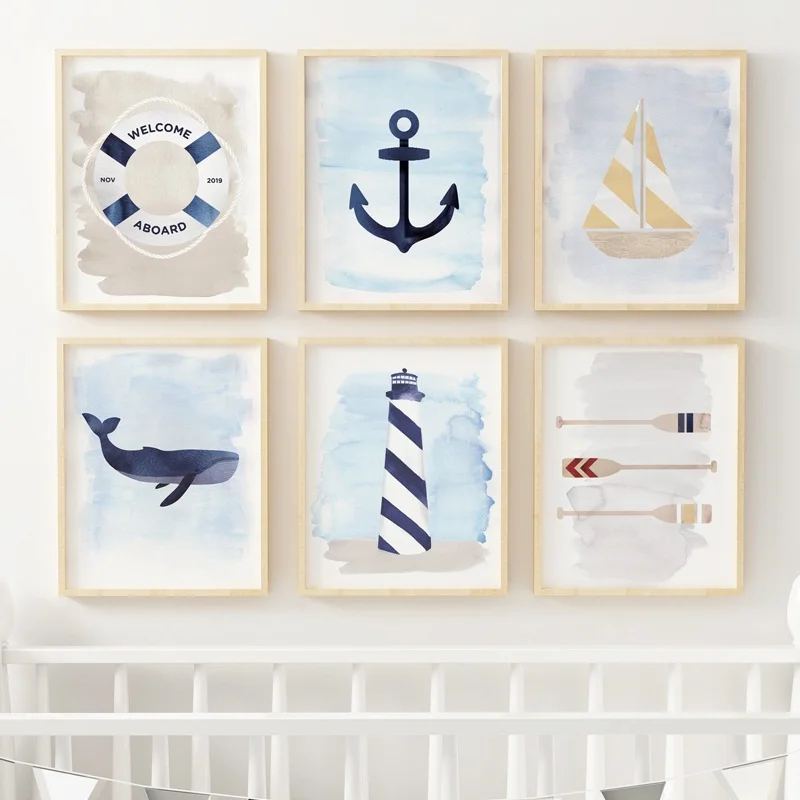 Постер в скандинавском стиле с изображением Кита, лодки, маяков, На...