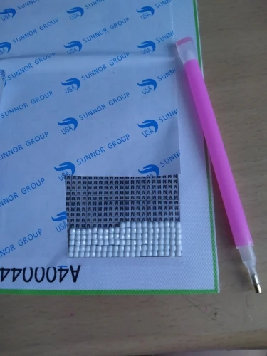 2. Вставьте круглый конец ручки в Дозирующий цемент (нажмите, чтобы сохранить цемент на месте). 3. Используйте круглый конец ручки, чтобы приклеить бриллиант и слегка нажмите, чтобы удалить любой дополнительный цемент. 4. Разорвите частичную пленку и поместите алмаз на холст в соответствии с соответствующим номером. 5. Если вы приклеите алмаз к неправильной области на картине, удалите алмаз пинцетом. 6. После завершения слегка прижмите алмазы рукой или книгой, чтобы убедиться, что алмазы надежно закреплены.