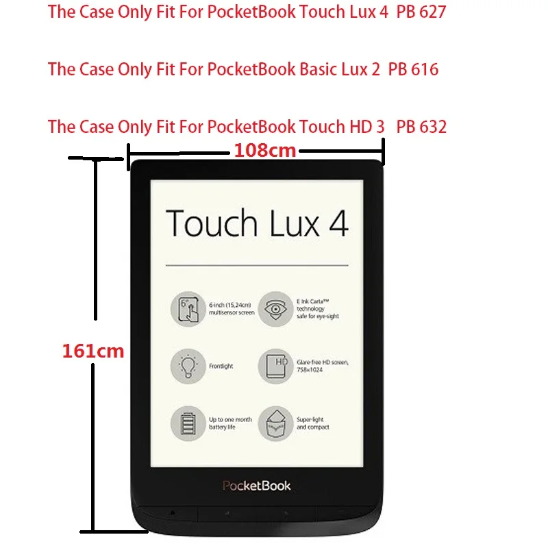 Чехол подходит только для PocketBook Touch Lux 4 PB 627 Чехол подходит только для PocketBook Basic Lux 2 PB 616 Чехол подходит только для PocketBook Touch HD 3 PB 632 Примечание: Не подходит для других электронных книг и читателей